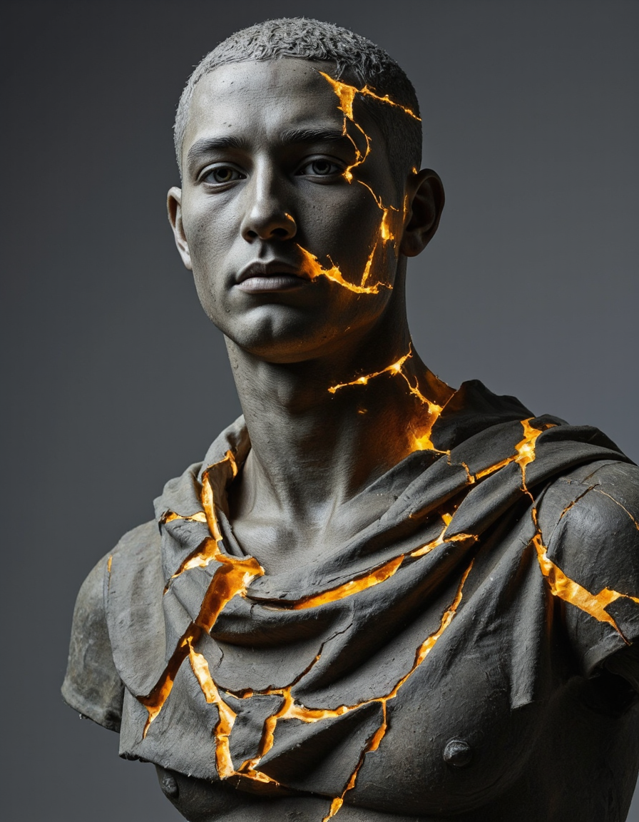 This striking digital artwork depicts a classical-style sculpture being transformed by an internal golden light that cracks and fractures its surface. The piece masterfully combines the dignified pose and detailed drapery of traditional sculpture with contemporary digital effects, creating a powerful metaphor for transformation or awakening. The contrast between the cool, white exterior and the warm, golden light breaking through creates a dramatic visual effect, while the upward-gazing pose adds a sense of transcendence to the overall composition.
