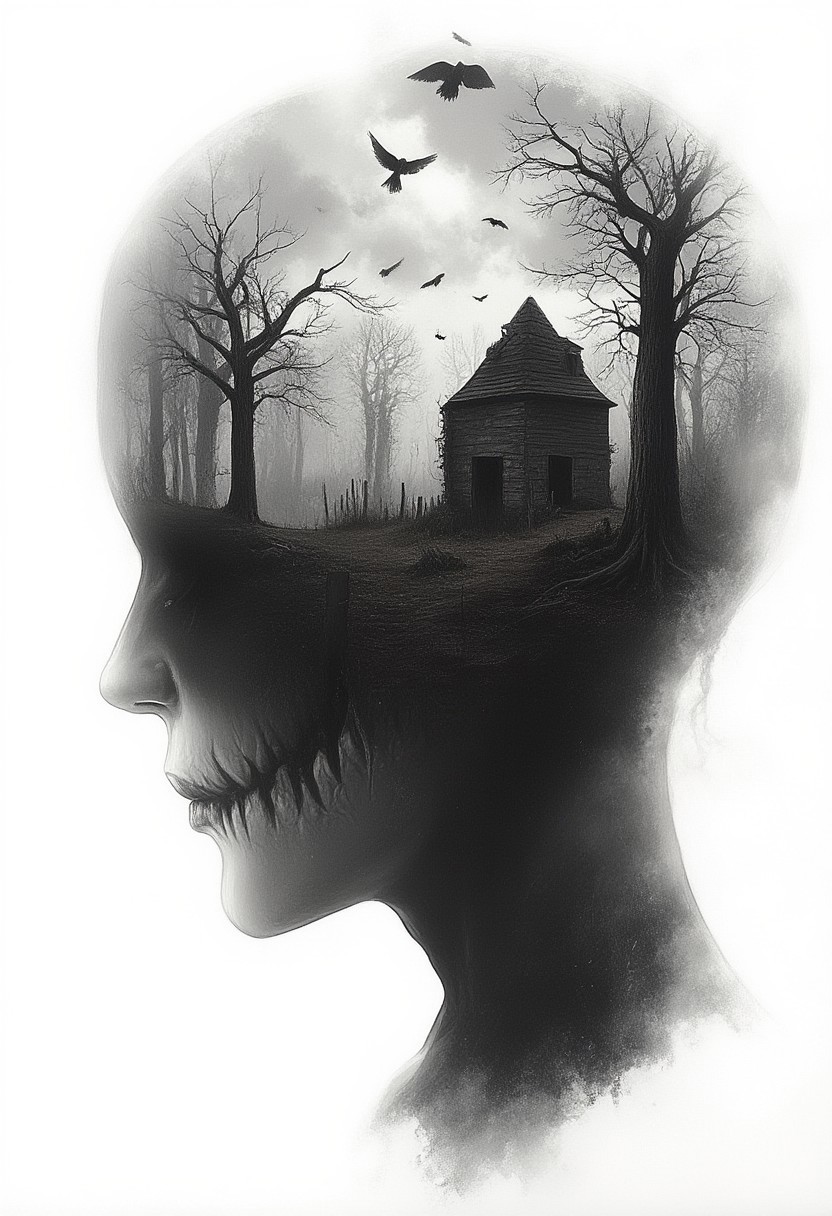 silhouette of jack o lantern head, within which there appears to be a horror with old buildings in the forest. (crows flying around, into the distance), giving a sense of creepy and horror sense. The visual style blends the human form with horror forest landscape. The monochrome tones. Double exposure style with white background.