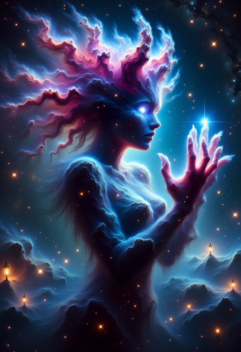 strangestructures, mad-nbla, a cloud of prismatic gas (in the shape of a female punk rocker with glowing eyes and spiked hair making the hand-horns symbol, sign of the horns), crystal prison (quartz, beautiful, ominous, massive), landscape (obsidian, silhouette, serpentine), hard shadows, 6 lanterns, a frozen lake, mist, little light, High quality, Few colors, dark, chiaroscuro, low-key, ng_deepnegative_v1_75t, easynegative,