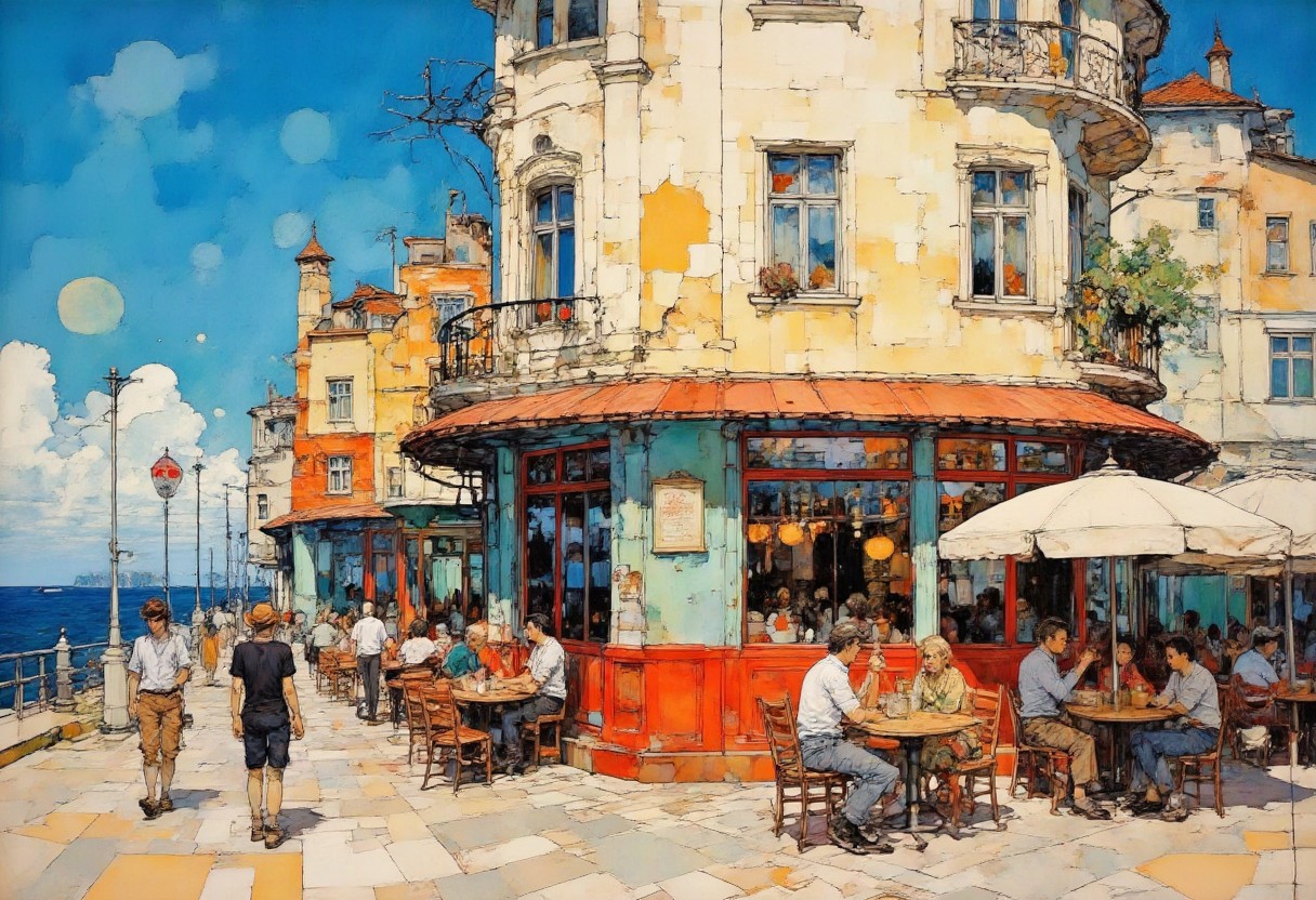 This image is a digital painting with a vibrant, impressionistic style. It depicts a vintage cafe exterior A seaside cafe on a pier.