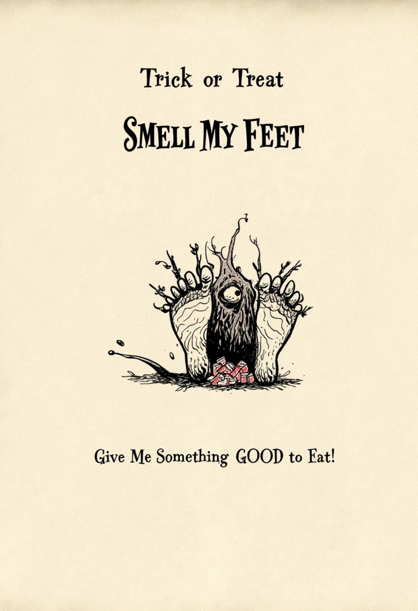 Text that says "Trick or Treat SMELL MY FEET", A monster with huge dirty feet, holding a bucket of candy, ink on paper, below is text that says "Give Me Something GOOD TO EAT"