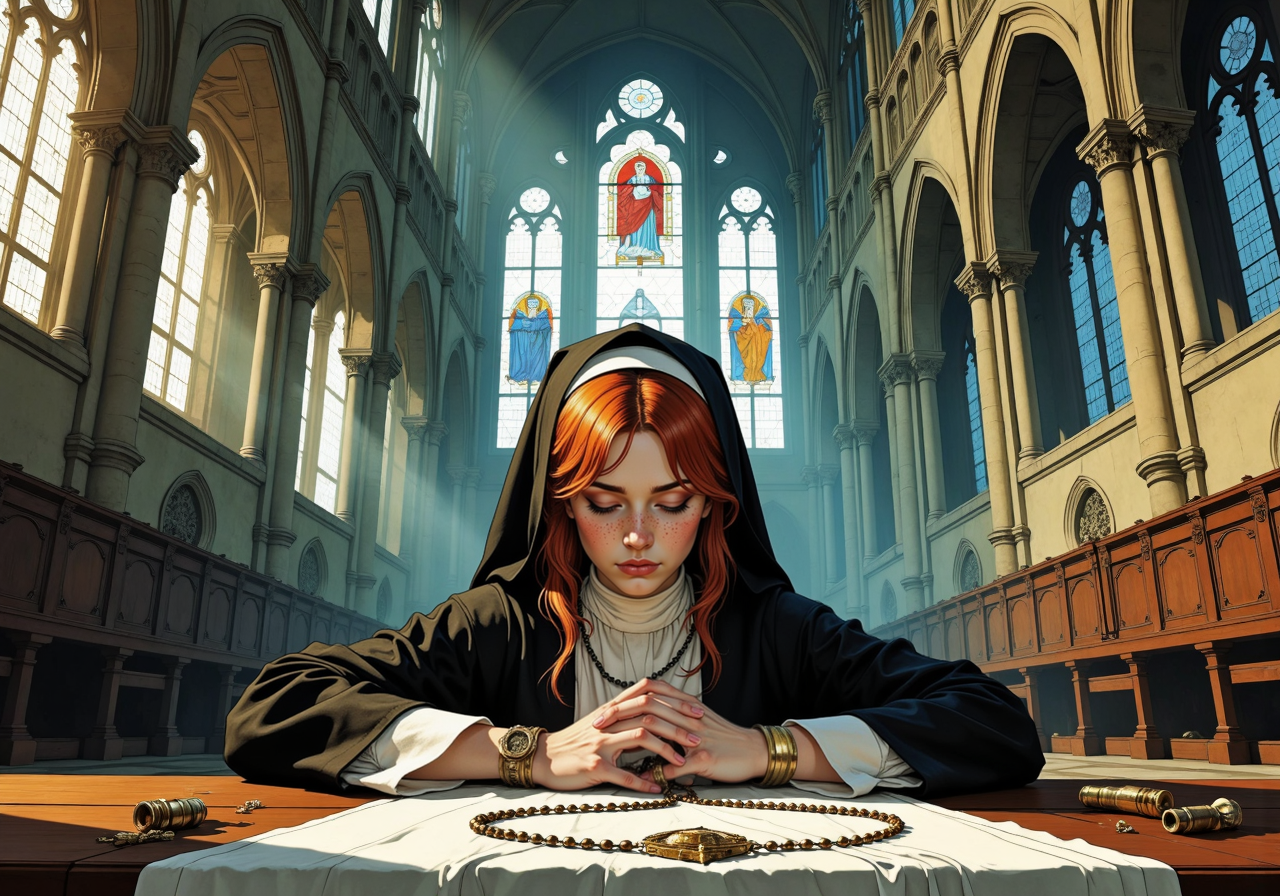 a digital illustration of, A young woman with auburn-brown hair peeks out from beneath her habit as she kneels at the altar of a vast, empty cathedral, the light from tall stained glass windows casting colorful reflections onto her pale skin. Her hands are clasped tightly in prayer, but hidden beneath her robes is a rosary made of heavy silver bullets, each one carefully blessed for an impending battle against the demonic forces lurking just beyond the church walls.<lora:Illustration concept variant 2.safetensors:1.0:1.0>