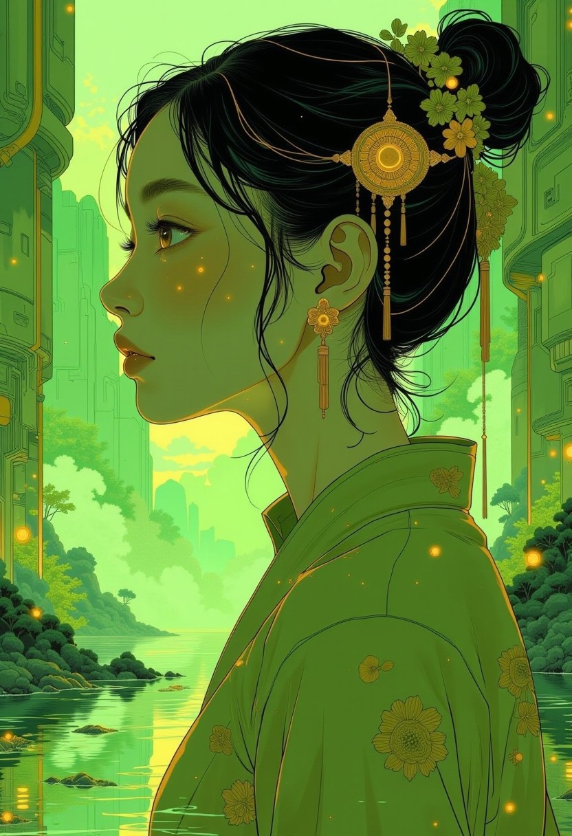 Green future, Chinese traiditional woman, wearing a golden hair pin, olive green gradient, Scenary of an alien world filled with water, floating tiles on water