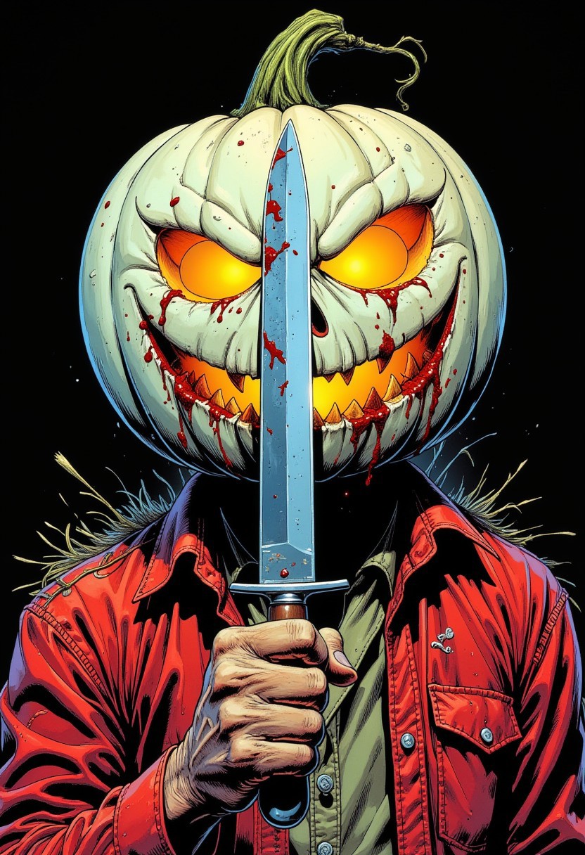 Comic book style of A terrifying creepy killer (with a white jack o lantern pumpkin as a head), fiery glowing yellow eyes, and a sinister wide smile carved into the pumpkin,. Holding up a sharp bloody knife straight up in front of them, dressed in red flannel shirt with straw stuffing coming out