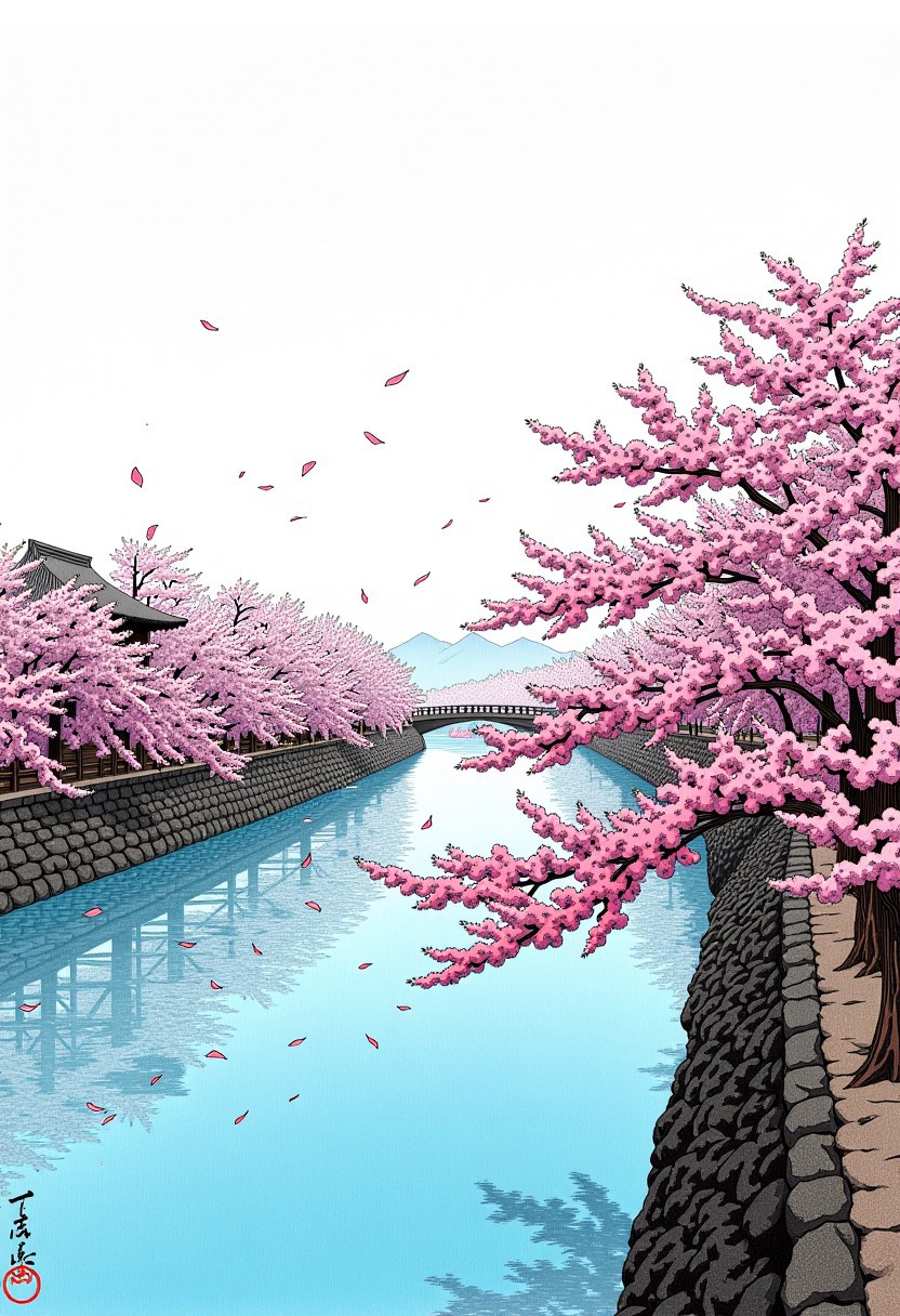 Cherry blossom trees line the riverbanks. Somber dark coloring, faded,Pink cherry blossom petals softly fall off the trees by Hasui Kawase .Hkawa