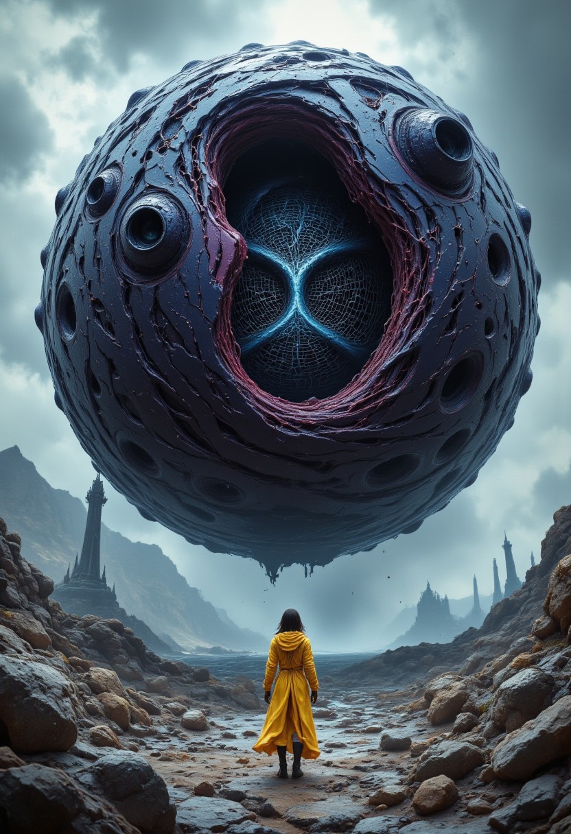 A hauntingly beautiful dark fantasy/sci-fi scene featuring a vast, barren landscape with a colossal organic spherical object. The sphere, made up of twisted, intertwined organic materials in a blue-violet color and deep maroon veins, reveals a hollow core with a mesmerizing mesh structure. The sphere is riddled with large black eyes that are woven into the structure of the sphere. A mysterious woman dressed in a yellow hazmat suit stands on the rocky terrain, staring intently at the enigmatic sphere. An overcast sky hangs over her, creating an eerie atmosphere on the desolate landscape. In the distance, ominous structures can be seen on the horizon, hinting at a wider world full of intrigue and danger. This striking image evokes a sense of wonder and curiosity, inviting viewers to explore the mysterious world that lies within, cinematic, poster, painting, dark fantasy, conceptual art. Micro details, facture surface, detail sphere and ground