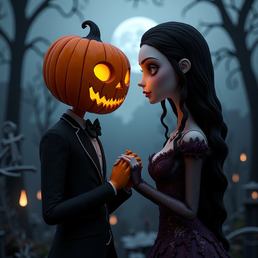 Tburton_style, A humanoid jack o'lantern, sporting a suit and bright orange skin tone, clasps hands with a gothic vampire princess in a moonlit graveyard. The vampire, with porcelain skin and dark, intricate clothing, gazes longingly at the pumpkin-headed figure. A bloody moon looms above, casting dramatic shadows. The composition combines the styles of Tim Burton and Bram Stoker, with a high-contrast, desaturated color palette and subtle film grain. A single, dramatic spotlight illuminates the couple from above, casting deep shadows and creating a romantic, yet eerie atmosphere