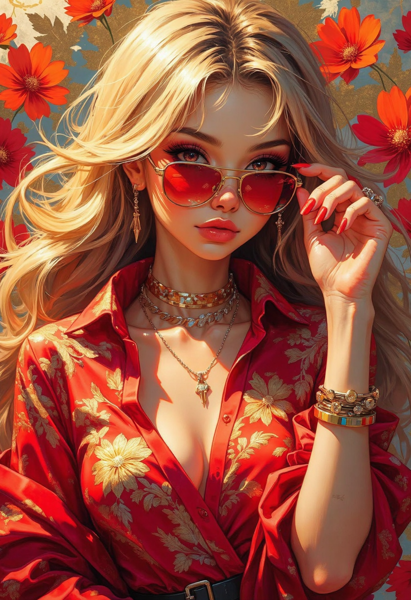 anime artwork close up side shot, portrait of a glamorous young woman with long, flowing blonde hair, radiant skin, bold red blouse with intricate golden floral patterns, alluring, seductive, layered red jacket, glasses tilt pose, over-the-glasses gaze, sleek gold-rimmed aviator sunglasses,looking at viewer with a curious look, adorned with gold and silver necklaces, vibrant red nails, colorful rings, and a gold bangle. The background is an artistic explosion of swirling golden sunbursts and crimson floral motifs, reminiscent of a dreamlike tapestry. The lighting is vibrant and warm, creating a dynamic interplay of red and gold hues that enhances her confident and sophisticated aura. Ultra-detailed with intricate textures, capturing elegance and artistic vibrancy, closed mouth <lora:FLUX-daubrez-DB4RZ-v2:0.3> DB4RZ, <lora:flux.1_lora_ink-dynamic:0.7> <lora:Midjourney_-_SemiReal_Dreams_FLUX_LoRA:0.6> . anime style, key visual, vibrant, studio anime, highly detailed