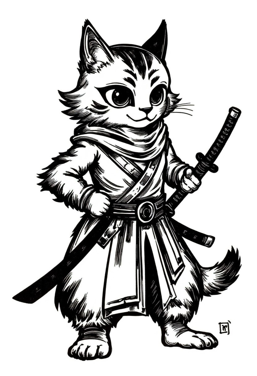 k1ooster black and white drawing of fluffy, medium-sized cat named Allie with a mottled coat featuring dark brown and black tabby stripes dressed as a ninja wielding a katana