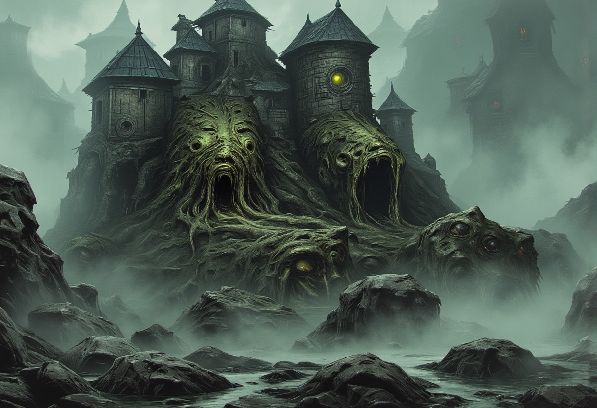 Ilustration in DarkestDungeon style of ruined castle placed on the island that is floating in the air above the mountains covered in Creeping Fog. The castle is overgown with shapeless flesh growin in random part of the castle, the flesh on castle walls is also covered in eyes, eyes on the fleshy parts of castle are empy, black and have no pupil or iris, just pure black sclera. In the castle windows there are diffrent set of eyes, massive glowing yellow ones with red glowing pupils. The castle gate is a gianting gaping mouth filled with multiple ets of teeths. the ground around the castle is filled with old bones, and fleshy tentacles.