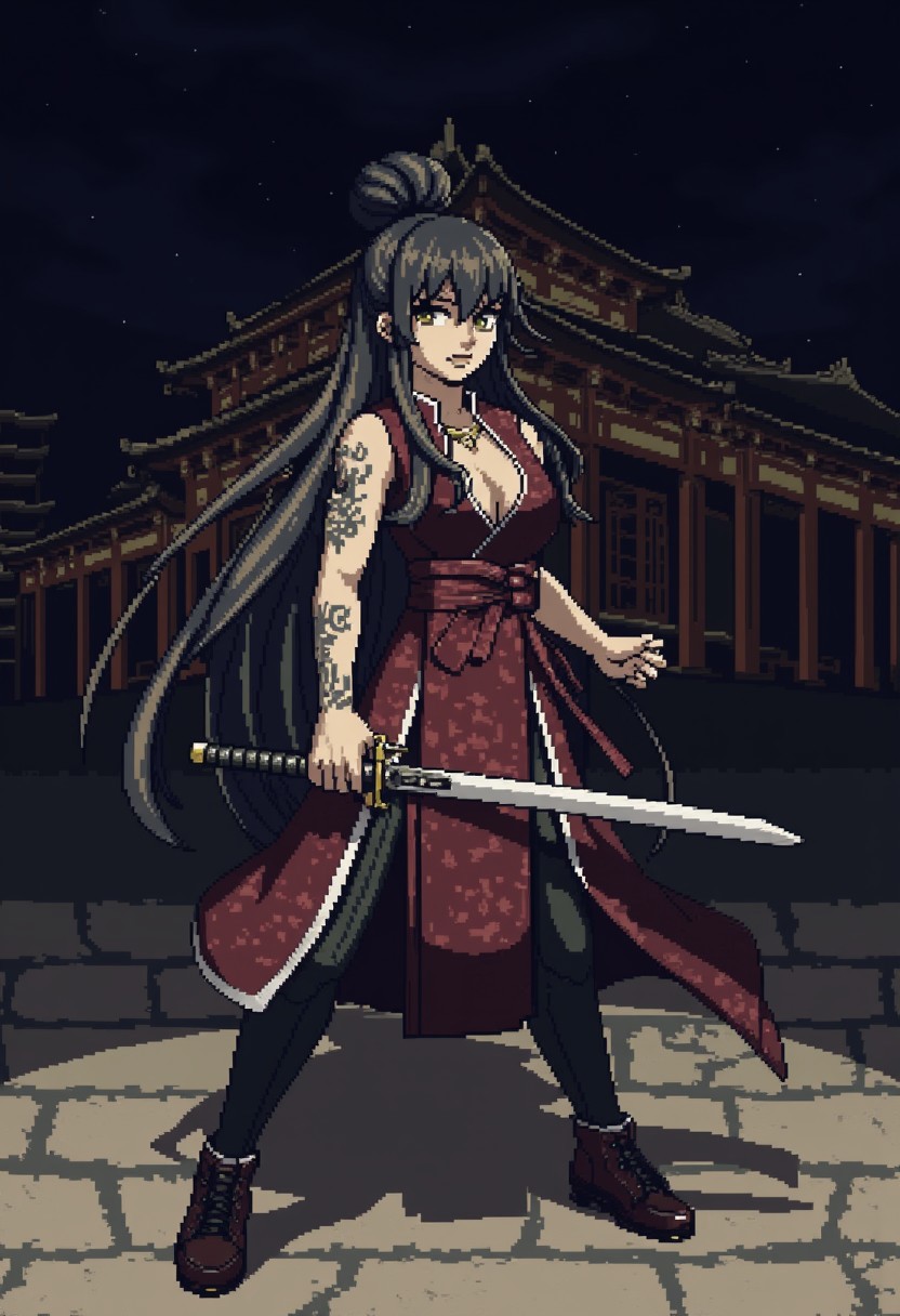 Very long black hair, brown gradient hair, high hair bun, brown eyes, pale skin, medium breasts, full right arm tattoo, sleeveless_kimono, Chinese attire, detailed background, chinese temple, tough face, night, dynamic pose, shadows, posing, Standing, holding a sword, dark light, ck-8bit-gameboy