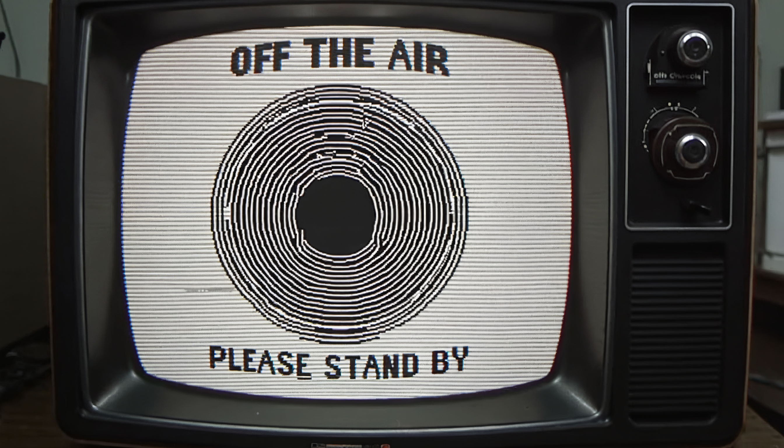 Vintage television "Off the Air" screen with modern digital distortions. A predominantly grayscale image featuring a central circular test pattern, slightly off-center due to poor signal. Bold text reading "OFF THE AIR" at the top, with "PLEASE STAND BY" below in a retro digital font, both flickering intermittently. The test pattern's concentric circles and radial lines are interrupted by occasional horizontal scan lines and pixelated blocks. Static noise peppers the entire image, more concentrated in certain areas, creating a grainy texture. Random color artifacts - brief flashes of red, green, and blue - appear sporadically across the screen. Glitch effects distort parts of the image: momentary tears, stretched pixels, and misaligned sections that appear to "slide" horizontally. Digital compression artifacts manifest as blocky patterns in darker areas. The edges of the screen show slight curvature and darkening, mimicking an old CRT television. In the corner, a small station identification logo repeatedly tries to render but glitches out. The background behind the main elements subtly shifts in brightness, creating a pulsing effect. Faint ghosting of previous frames lingers, adding to the unstable appearance. Overall, the image evokes a sense of technical malfunction blending retro television aesthetics with contemporary digital error effects, creating an unsettling yet nostalgic atmosphere.