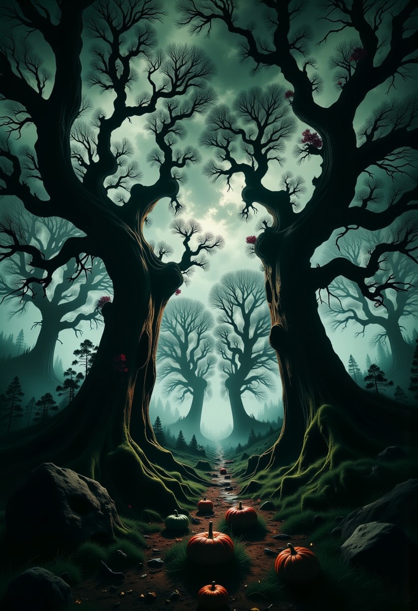 Ghostlystyle, a spooky landscape with twisted old trees with tines growing on them,ominous dark lighting, dimly lit, professional, high quality, 8k