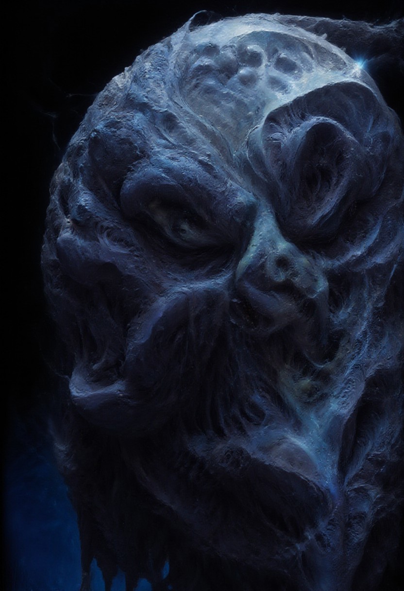 A close-up of a menacing creature's face, rendered in a dark and eerie style. The creature has a pale complexion, deep-set, cracked eyes, and sharp, menacing teeth. The color palette consists of deep blues, blacks, and grays, creating a somber and foreboding atmosphere. A deep blue background contrasts with the creature's pale skin, making it the focal point of the image
