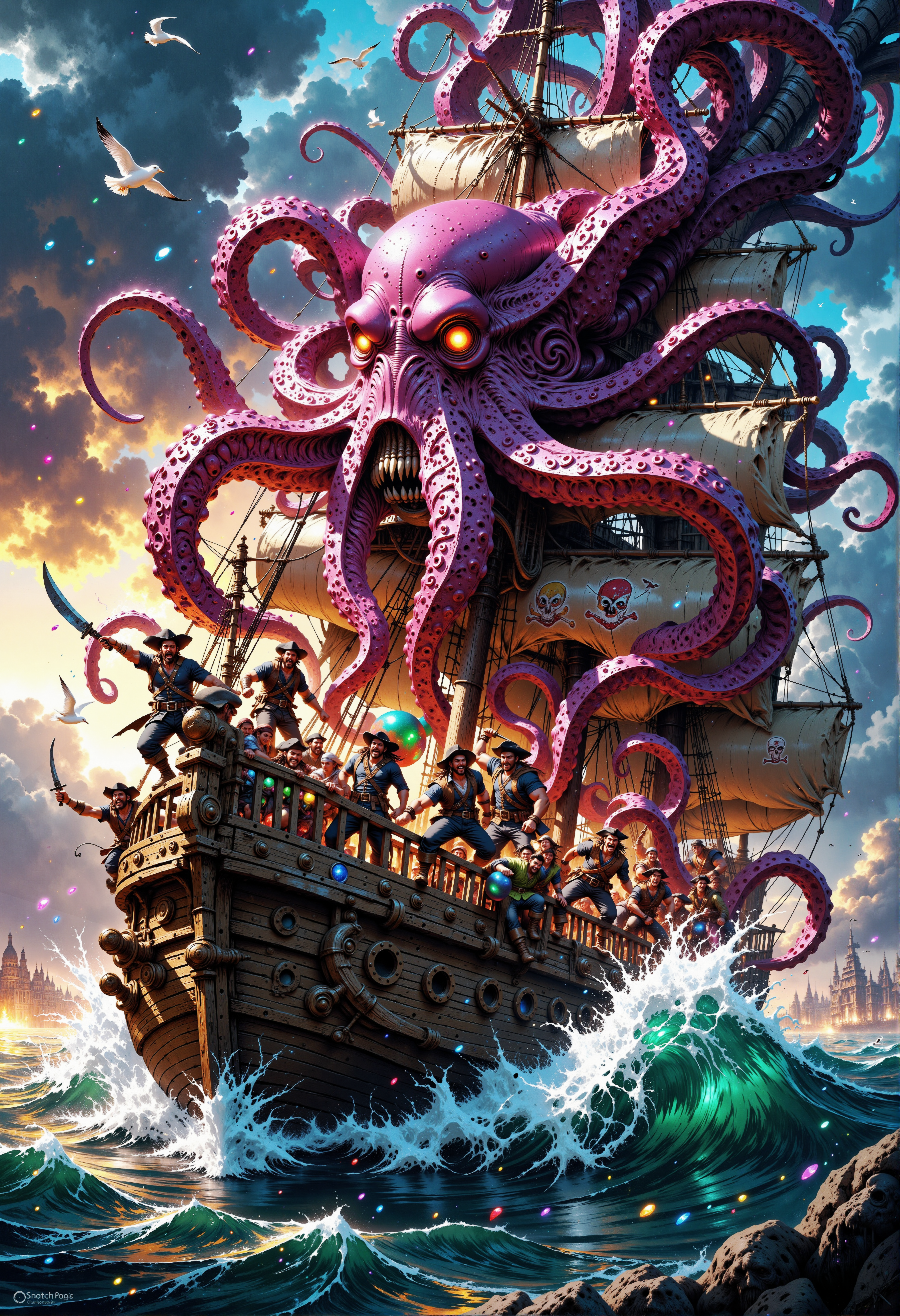 In a vibrant, bustling scene, a crew of rugged pirates is passionately navigating their majestic wooden ship through a dazzling ocean shimmering with gold and colorful jewels that sparkle like stars under the radiant sun. The waves undulate dramatically, reflecting hues of orange and purple while seagulls call out overhead, their cries blending with the sounds of laughter and shouts from the exuberant crew. The ship itself is adorned with tattered sails that billow energetically in the salty breeze, each canvas painted with the emblem of a fearsome skull and crossbones. The pirates, clad in an assortment of weather-beaten attire, display expressions of both excitement and trepidation as they scramble across the deck, their eyes wide with awe and exhilaration. Suddenly, a gigantic pink sea octopus, its tentacles glistening with iridescent colors, lunges menacingly toward the ship, creating a massive splash that sends glimmering droplets of seawater into the air. Each of its mighty limbs sways and wraps around the ship, the texture of its skin appearing both slippery and robust. The atmosphere is charged with a thrilling combination of fear and wonder as the pirates draw their cutlasses, their faces a mix of determination and exhilaration, ready to defend their prized treasures against the ferocious creature. The clash of adventure and danger creates an electric feeling, echoing the pulse of the vibrant ocean around them..<lora:Flux/Studio_Ghibli_Flux.safetensors:0.2:0.2> <lora:Flux/MysticAnimation.safetensors:0.2:0.2> <lora:Flux/MysticFantasy.safetensors:1.0:1.0>