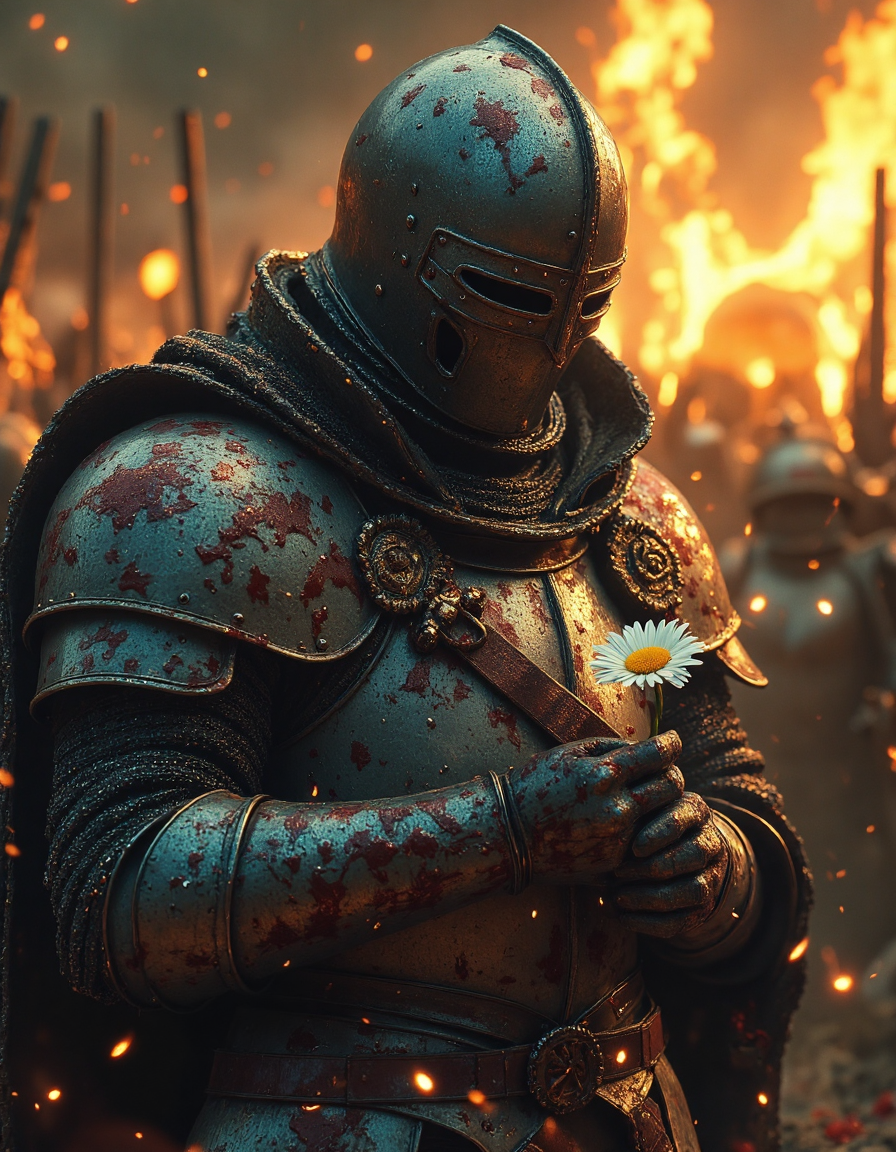 A lone, bloodied knight stands amidst a chaotic battlefield, holding a delicate white daisy. The knight is clad in heavy, weathered armor, and his helmet is obscured by shadow. The sun is setting, casting a golden glow over the scene. The overall atmosphere is somber and melancholic, aidmaMJ6.1, HKMagic, <lora:aidmaMJ6.1v0.4:0.6>, <lora:Dark Cinematic:0.6>, <lora:FantasyWizardWitchesFluxV2-000001:0.8>