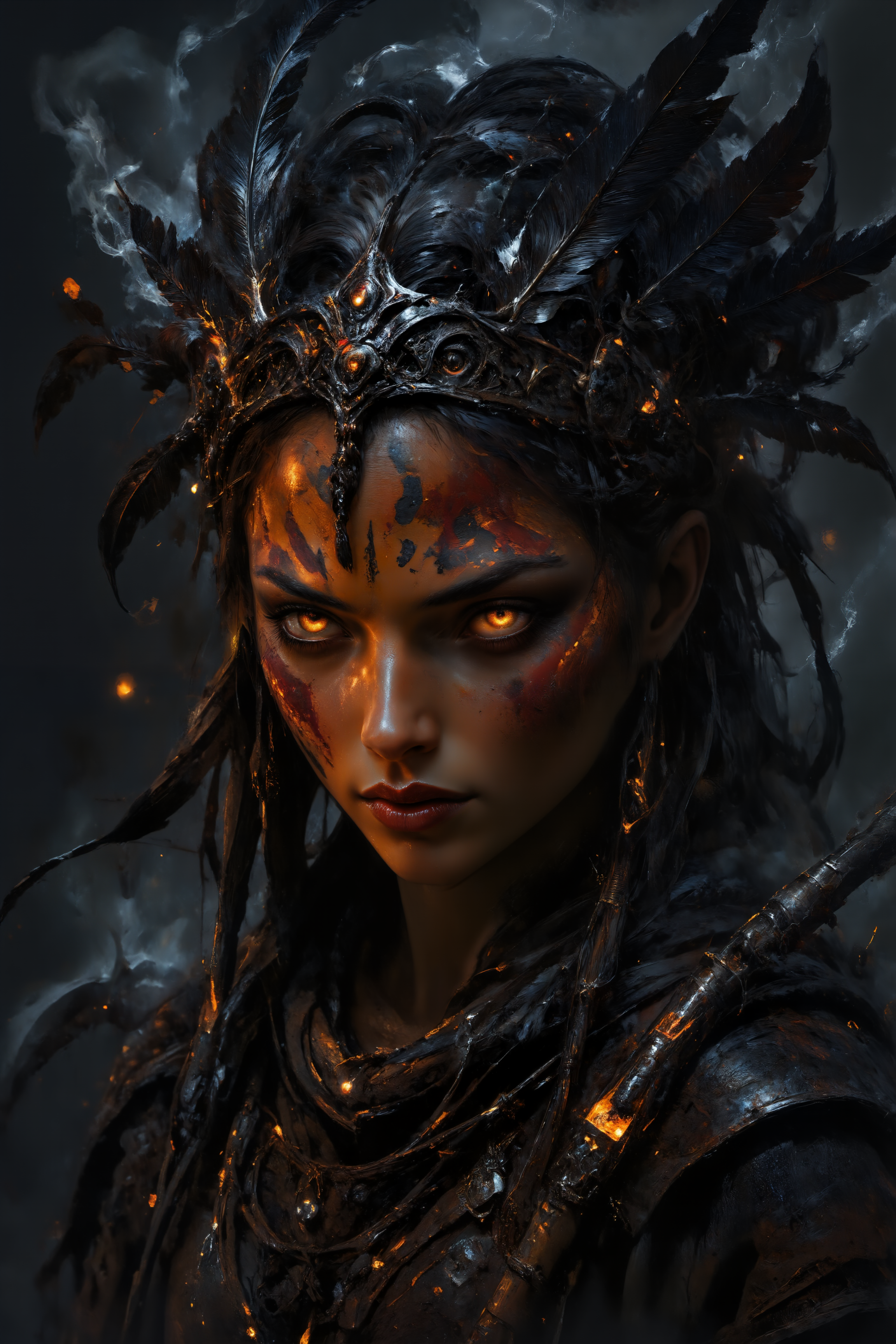 A close-up portrait of a tribal shamaness, her face adorned with layers of worn, painted patterns in shades of ochre and deep red. Her gaze is intense and unwavering, her bright amber eyes reflecting ancient campfires. Feathers of black and grey hang from a twisted leather circlet, swaying slightly in the breeze, while behind her, faint shadows of writhing spirits can be glimpsed through a thick, curling smoke. Her lips are pressed together in silent concentration, and the gnarled staff clutched in her hand has fragments of obsidian embedded in it, glinting ominously in the moonlight.<lora:FLUX-daubrez-DB4RZ-v2:0.6> <lora:artisketchyfs-v02:0.75> <lora:aidmaFLUXpro1.1:0.7> <lora:aidmaHyperRealismV0.2:0.4> <lora:Shattered_Void:0.62> <lora:MysticFantasy:0.4> <lora:Magic of Art (FLUX):0.4> <lora:HORROR_lora.TA_trained:0.8> <lora:lorafy_detail_enhancer:0.7>