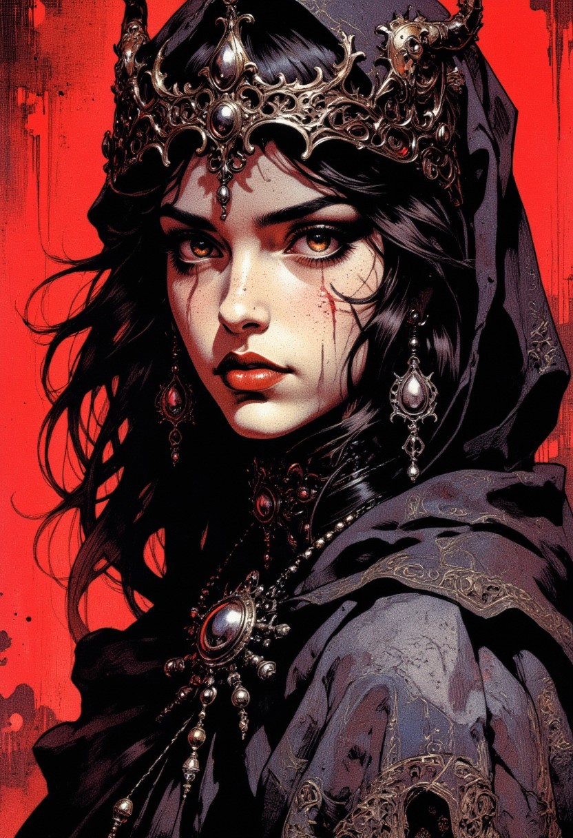 digital painting of a hauntingly beautiful woman with pale skin and dark, wavy hair in a three quarter side view close up shot. Her face is framed a dark intricately ornamented hood, creating a gothic, otherworldly appearance. She has intense, piercing eyes and a solemn expression. The background is a deep, fiery red, enhancing the dark, eerie atmosphere. The lighting is low, casting dramatic shadows that emphasize her haunting allure. The image is viewed from a slightly low angle, making her appear dominant and mysterious. The overall style is dark fantasy and retro horror art.
