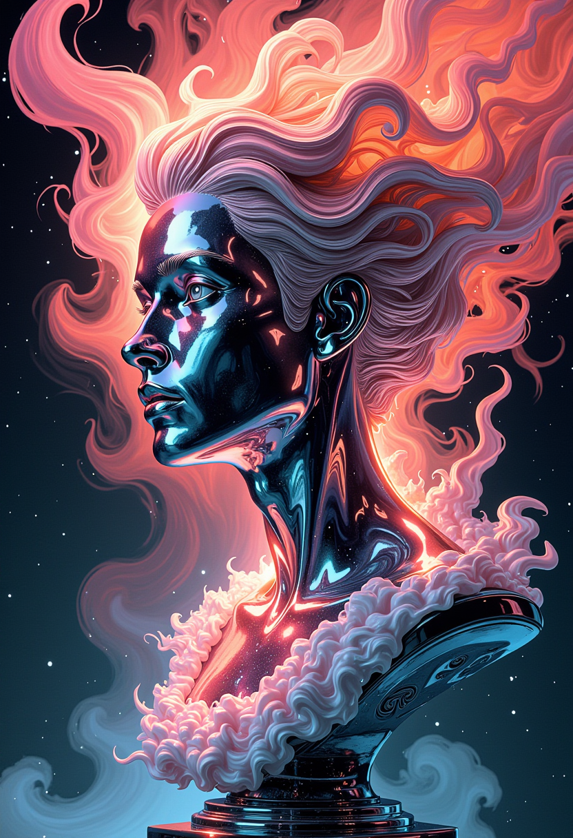 colorful art by Tang Yau Hoong, Conrad Roset and Classic Disney, The bust of a masterful Reflective bust is illuminated by the soft glow of an otherworldly light. Surrounding it are a sea of shimmering silver smoke, enveloping the viewer in its depths. , 19th-century illustration, symbolist, inventive compositions, stencil technique, pulp magazine illustration, German Renaissance, caricature, exploration of beauty and desire, soft, exploration of love and longing, Ukiyo-e, female subjects, epic composition, complex artistic color composition, rich deep colors, illustrious, <lora:models\Flux\ck-candyFLUX:0.3> <lora:models\Flux\50samerica:0.3> <lora:models\Flux\dvr-chrm-flux:0.3> <lora:models\Flux\Vintage comic book:0.3> <lora:models\Flux\zavy-lch-flx:0.3>,