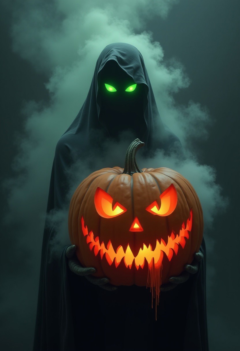 A dark phantom made of smoke with no physical form with glowing green eyes holding a grotesque dripping jack-o-lantern with a mischievous grin