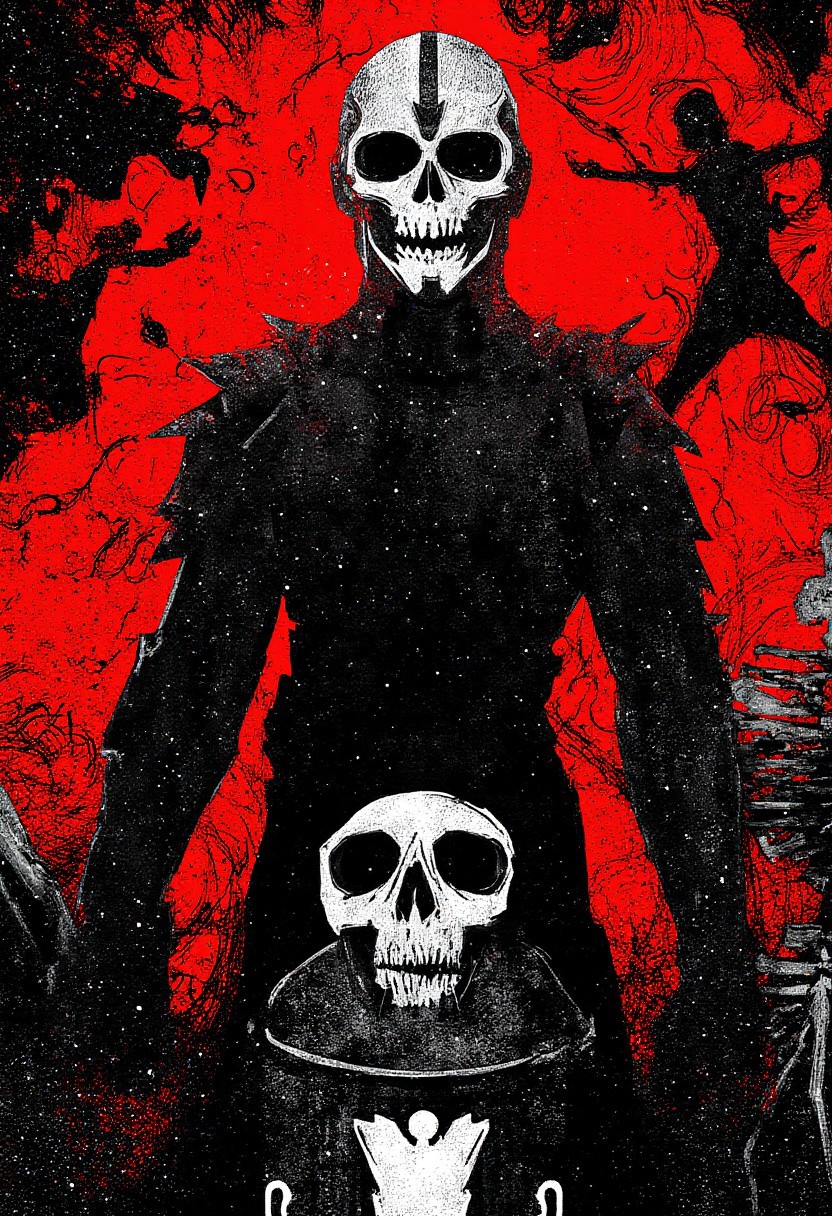 This is a digital artwork featuring a stylized, dark, and chaotic scene. The central figure is a large, imposing, futuristic, armored creature with a menacing, skeletal face and a helmet adorned with sharp, angular features. The creature's body is covered in dark, metallic armor with intricate, sharp edges and a prominent, menacing skull-like visor. It stands atop a pedestal or platform, which is adorned with a patterned, ornate collar and chains, adding to the ominous atmosphere. The background is a vibrant, chaotic mix of red, black, and white patterns, featuring abstract shapes and symbols that resemble stylized flames, gears, and circuitry. The overall color scheme is dominated by deep reds and blacks, with splashes of white and metallic shades. The artwork is rich in texture, with a distressed, gritty quality that gives it an industrial, worn appearance. In the background, there are additional elements such as a stylized, skeletal figure, a futuristic spaceship, and a swirling, cosmic background with stars and nebulae, contributing to the scene's sci-fi, post-apocalyptic theme. The overall style blends elements of cyberpunk and gothic art, with a heavy emphasis on dark, industrial aesthetics.