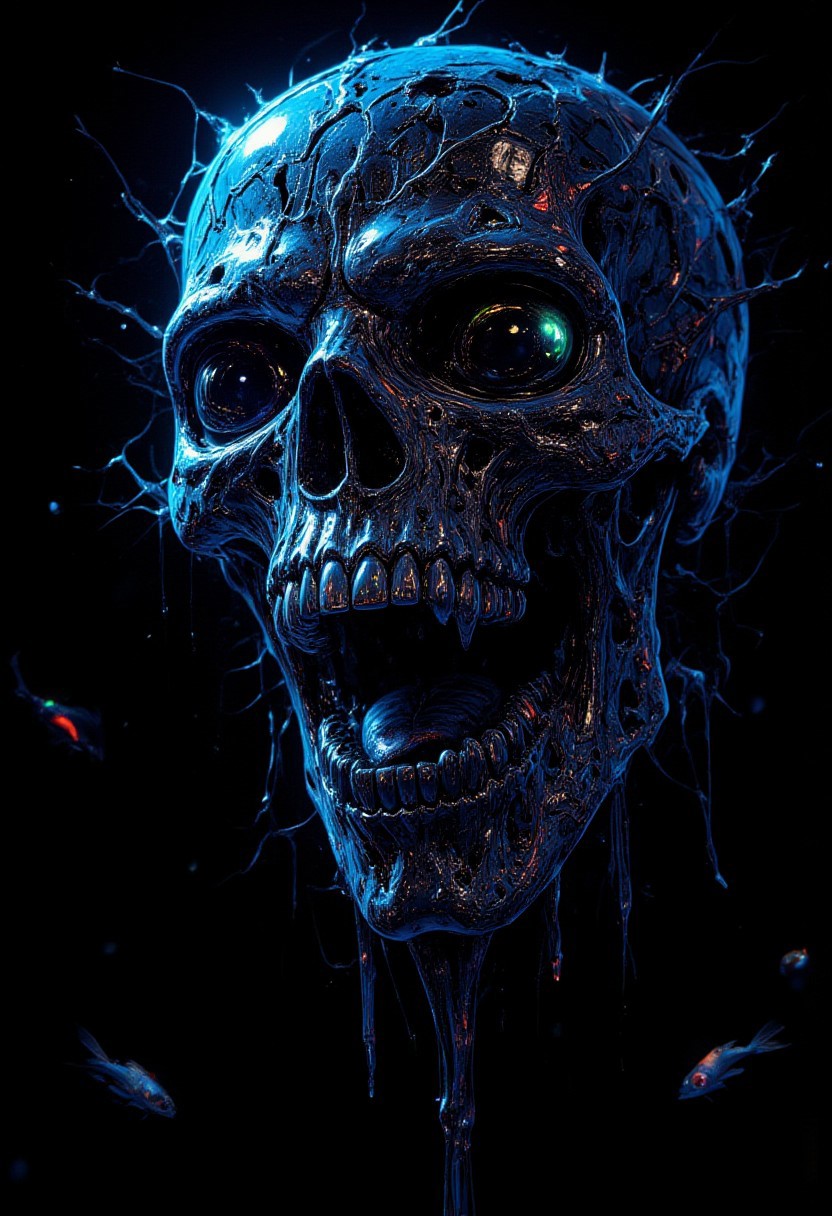 illustration, Beauty, Comic book style, grunge style, nightmare, horror show, mythp0rt, aidmaMJ6.1, play of shadow and light, 16k, high-difinition, 32-Bit-high color, high-resolution, high-fidelity, high-quality, ultra HD, super-resolution, enhanced detail, crystal clear, high-definition color, high-definition texture, sharpness boost, ultra-high quality, BREAK, close-up portrait of skull dichroic orchid jellyfish skull, betta fish, bioluminiscent creatures, intricate artwork by Tooth Wu and wlop and beeple. octane render, trending on artstation, greg rutkowski very coherent symmetrical artwork. cinematic, hyper realism, high detail, octane render,