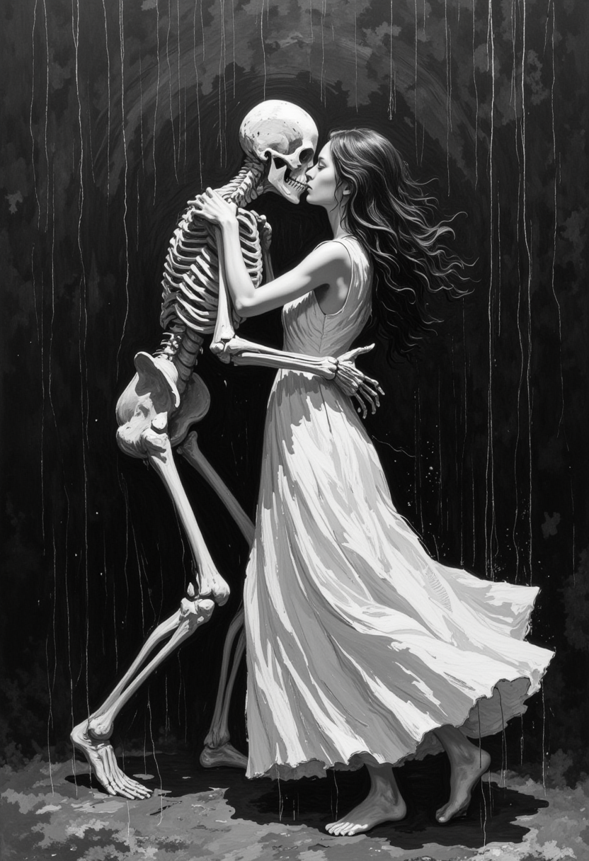 This haunting image captures a symbolic dance between life and death, with a skeleton leading a living woman in a poetic, rain-soaked scene. The monochromatic palette, heavy rain, and high contrast evoke a sense of sorrow and beauty, as if the figures are locked in an eternal embrace. The detailed anatomy of the skeleton contrasts with the ethereal flow of the woman’s dress and hair, enhancing the theme of mortality and the fleeting nature of life. The image invites introspection, urging the viewer to reflect on the beauty of life, even in the shadow of death.