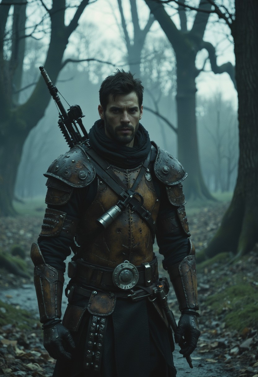 Witch Hunter in weathered leather armor, holding a crossbow loaded with silver bolts, standing at the entrance to a haunted forest, the trees twisted and gnarled, their branches reaching out like skeletal hands, the moonlight barely piercing the thick fog, his face set in grim determination, ready to face the horrors within, the scene capturing the grim resolve of 'Van Helsing'., in the style of live action dark fantasy, retro, 80s Panavision look and feel, high contrast, lens flares, film grain, retro aesthetic, soft focus, deep shadows, vibrant saturation, authentic 1980s vibe, nostalgic, dreamcore , autumn dreamcore, samhain,
