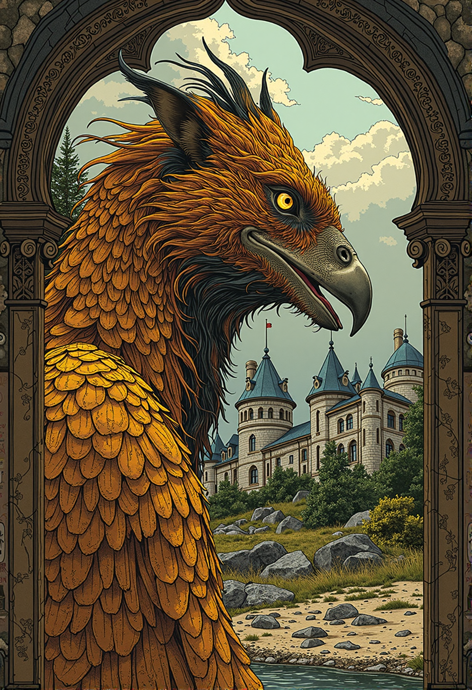 <lora:models\Flux\Fantastic Realism - s0_8 g4:0.8> f4nt4st1c,, Intricately textured The intricate stained glass of a grand castle reveals a scene of a phoenix bursts through the glass, its long neck twisted and its eyes fixed on the throne of a king. The phoenix's scales shimmer in the light, and its eyes gleam with an otherworldly light. The scene is set in a grand castle, with towers and turrets looming in the background. The air is thick with the scent of sand and moss, and the sound of a nearby stream can be heard in the distance.