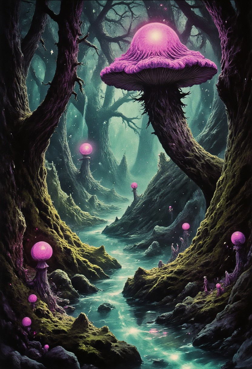 a dense fungal grove, giant mushrooms with glowing caps of purple and green tower overhead, their spores drifting like faint sparks in the damp air, the forest floor is covered in moss and smaller fungi of every color, a trickling stream winds through the grove, its water glowing faintly blue, faint whispering voices seem to emanate from the shadows, and the air smells of earth and decay, a haunting yet beautiful sanctuary ArsMovieStill, movie still from a 1930s technicolor movie, SRT