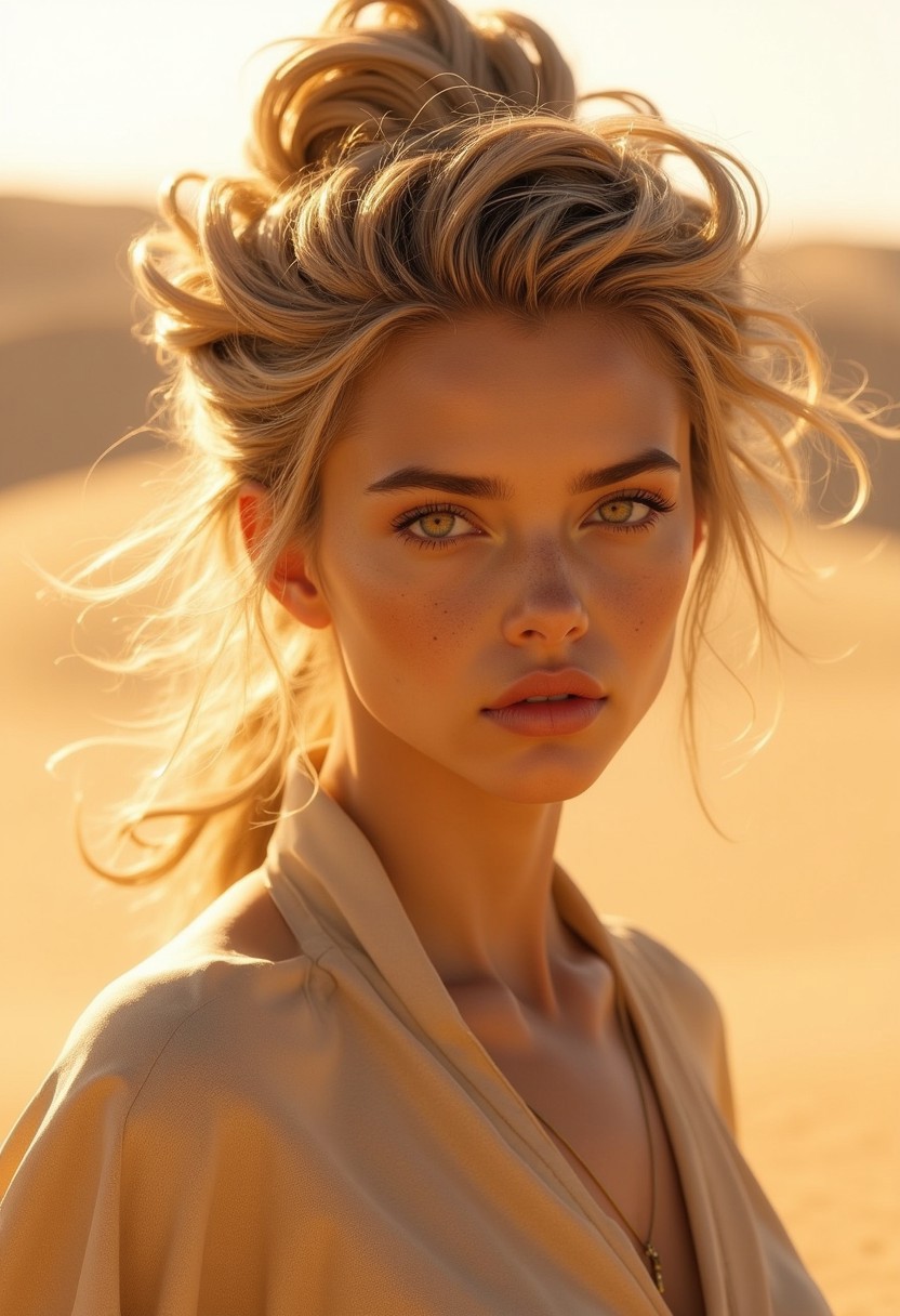 Create a hyper-realistic, professional-quality photograph of a young woman with skin tones resembling the soft, warm hues of sand dunes, ranging from beige to golden brown. Her face has subtle, grainy textures like sand, adding an earthy, natural feel to her look. Her hair is sculpted into an intricate, surreal style resembling wind-swept sand formations, with strands twisted and layered in swirling patterns that mimic the waves and ridges of desert dunes. Her eyes are a striking amber, glowing like sunlight on a vast desert, giving her an intense, mysterious gaze. Her clothing is modest and crafted from light, sandy fabrics that flow and blend with her surroundings, resembling layers of silk or fine desert dust. The scene is set in an expansive, golden desert, with rolling dunes stretching into the horizon and the soft light of a setting sun casting long shadows across the sand. Gentle wind sweeps through, lifting grains of sand that dance around her, adding movement and life to the composition. The natural lighting enhances the warm tones of her skin and the intricate detail of her sand-inspired hairstyle, creating an otherworldly, ethereal image that embodies the beauty and vastness of the desert