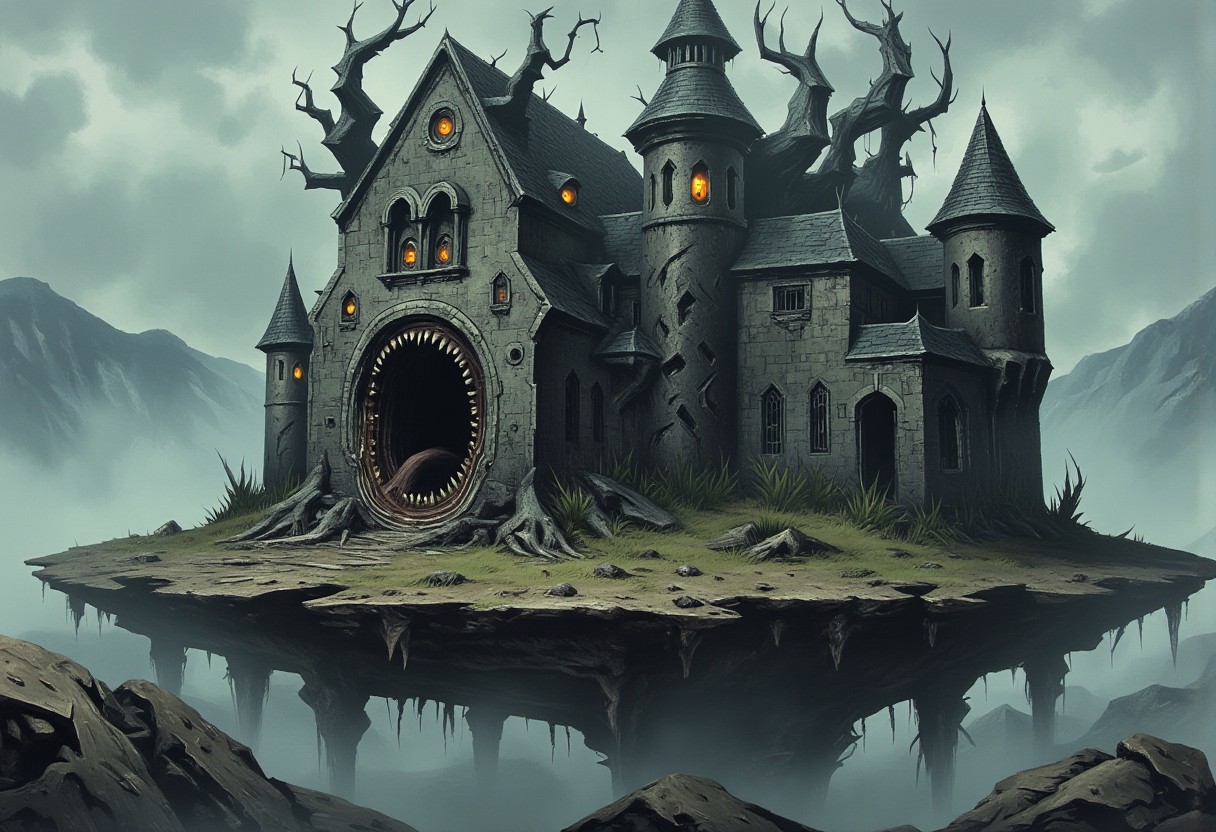 Ilustration in DarkestDungeon style of ruined castle placed on the island that is floating in the air above the mountains covered in Creeping Fog. The castle is overgown with shapeless flesh growin in random part of the castle, the flesh on castle walls is also covered in eyes, eyes on the fleshy parts of castle are empy, black and have no pupil or iris, just pure black sclera. In the castle windows there are diffrent set of eyes, massive glowing yellow ones with red glowing pupils. The castle gate is a gianting gaping mouth filled with multiple ets of teeths. the ground around the castle is filled with old bones, and fleshy tentacles.