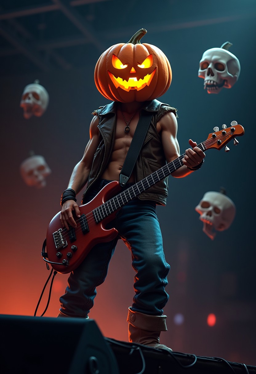 score_6_up, score_5_up, score_9, score_8_up, score_7_up, jack o lantern, 1jack o lantern, solo, pumpkin head character, evil grin, glowing yellow eyes and mouth, wearing a sleeveless leather jacket, jean pants, playing a rock guitar, on a rock concert stage, ghostly skull heads flying in the back ground. night stage lighting, from below