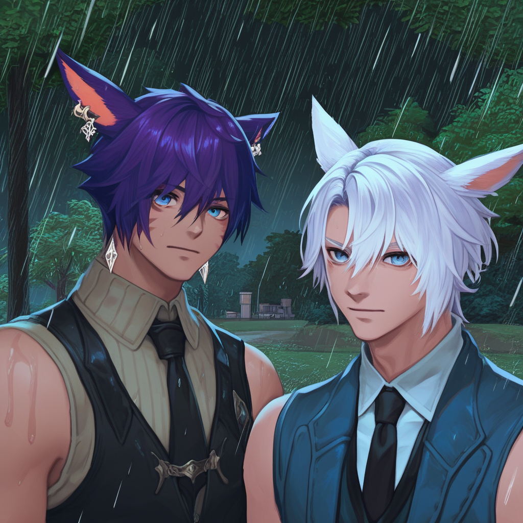 dt_xiv_style, looking at viewer, short hair, blue eyes, shirt, animal ears, jewelry, jacket, purple hair, white hair, male focus, earrings, outdoors, multiple boys, necktie, sleeveless, 2boys, tree, rain, miqo'te, score_9, score_8_up, score_7_up, score_6_up, score_5_up, score_4_up,