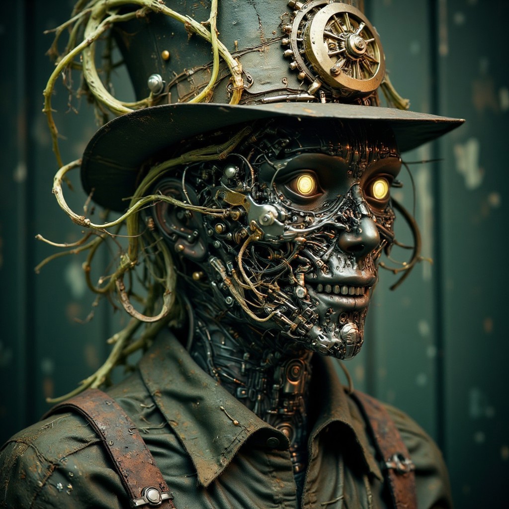 Recypu style,A hyper-realistic photo portrait of a peculiar and unsettling cyborg character with humanoid features. His face combines twisted green roots and metal implants, blending organic and mechanical elements. Large, hollow eyes have glowing mechanical lenses, adding a haunting gaze. His metallic jaw is integrated with sharp, uneven teeth mixed with twisted vines, while rough, bark-like textures and metal patches cover his 'skin.' Tendrils and wires extend outward from his head and neck in a chaotic fashion, enhancing his unnatural appearance. The character wears an old, weathered top hat decorated with rusty gears and metal accents, creating a steampunk vibe. The hat sits slightly askew, enhancing his bizarre look. His clothes are old-fashioned and tattered: a faded green shirt with frayed edges and worn suspenders. The background is a muted, eerie green, enhancing the surreal atmosphere of the portrait. Soft but moody lighting casts subtle shadows, emphasizing the twisted, otherworldly features and making the character both fascinating and unsettling,futuristicportrait