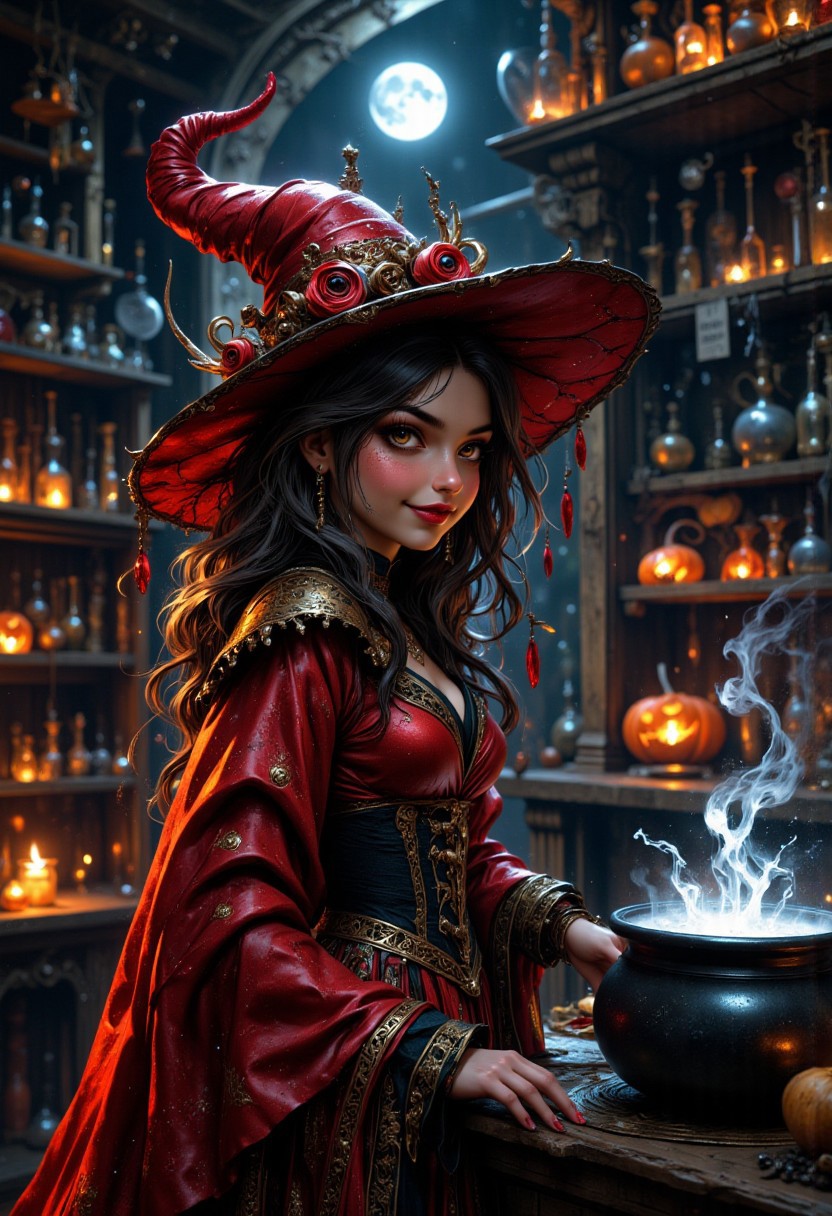 The hall is bright and enchanting, a very cute, little witch, with a black cat slinking between her legs, greets you with smiles that invoke happiness and safety at your welcomed intrusion, her presence is playful and inviting. her gown ornate with bright hues red and gold, her eyes flicker gold hues in the darkness of her chamber. Her chamber is filled with alchemy vials, bookcases and shelves. she stand in from of a bubbling caldron with the steam turning into little, happy, ghosts. The shelves are decorated with halloween pumpkins, fun candles and bubbling concoctions. Her presence also invokes joy and playfulness. She beckons you to join her with a cute and devilish smile. closeup portrait, hyperdetailed, 8k resolution, concept art, bright colors, hyperrealism, digital illustration, intricate, vapor, complex, ethereal, horror, dark environment, (&:0)t (photography, high-resolution, dynamic, energetic,hyper-realistic, dramatic lighting, shallow depth of field.)