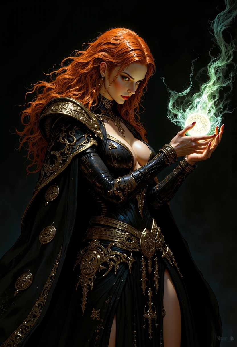 A striking portrait of a ginger-haired sorceress, her fiery curls tumbling over her shoulders, glowing with a hint of magic. She wears a form-fitting, dark leather outfit adorned with intricate golden runes that hug her curvy figure. The outfit is revealing yet tasteful, with a plunging neckline that enhances her mystique. Her long, slender arms are adorned with delicate silver cuffs. In one hand, she holds a glowing orb of magical energy, casting a spell with tendrils of light swirling from her fingertips, while her other hand is raised to control the flow of energy. Her piercing green eyes burn with intensity, and her lips are painted in a seductive shade of red. The background is a deep, inky black, with minimal light filtering through, creating a dramatic contrast. The soft glow from her magic provides the only source of illumination, making her figure the focal point of the composition. Framed in a cowboy shot, the image captures her from the waist up, with the magic and her powerful presence dominating the frame, evoking a sense of mystery and allure.