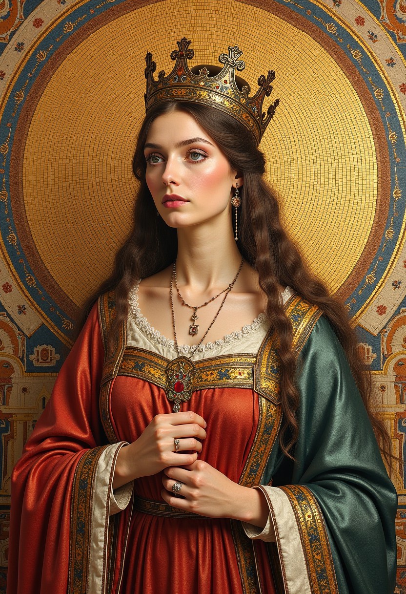Byzantine empress with crown standing in front of a big byzantine mosaic with colorful pattern