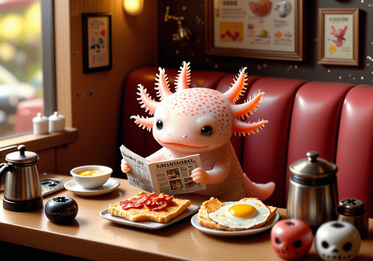 tilt shift of image of tiny cozyspooky axolotls wearing little outfits, high-angle shot of a pink axolotl at a small corner diner, seated at the counter with a tiny plate of bacon, eggs, and toast, while holding a miniature newspaper; its frilly gills sway gently, and its round black eyes are focused as it reads; classic diner details like a coffee pot, salt and pepper shakers, and condiments sit along the counter, and the tilt-shift effect softly blurs the other seats and retro wall decor, creating a cozy morning scene filled with nostalgic charm, the axolotls have round black eyes and pink frilly gills, the tilt-shift effect creates a miniature scale appearance by softly blurring the background while keeping the primary subject in sharp, focused detail; the transition from clarity to blur is gradual, adding depth and emphasizing the small scale, with foreground elements subtly fading into softness; this effect enhances the sceneâs tiny, delicate feel, giving a lifelike sense of dimension and realism to each element, as if viewed in close-up with a shallow depth of field, OBwawa, Momiji Message Dolls, axolotl<lora:Axomodel_Flux_V1.1.safetensors:1.0:1.0> <lora:OB红å¶çè¨å¨å¨.safetensors:0.65:0.65>
