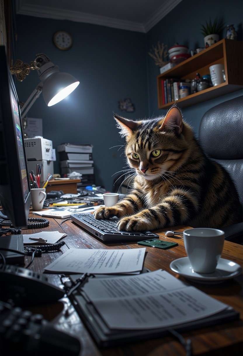 A frustrated cat sits hunched over at a cluttered desk, staring blankly at the glowing screen of a computer. His expression is one of pure boredom and disdain, with narrowed eyes and drooping whiskers. The office setting around him is dull and lifeless, filled with paperwork, coffee cups, and a ringing phone. His paws rest on the keyboard as if typing, but his slumped posture and tired look show he’s had enough of this mundane, soul-draining job. The dull fluorescent lighting only adds to the feeling of exhaustion.