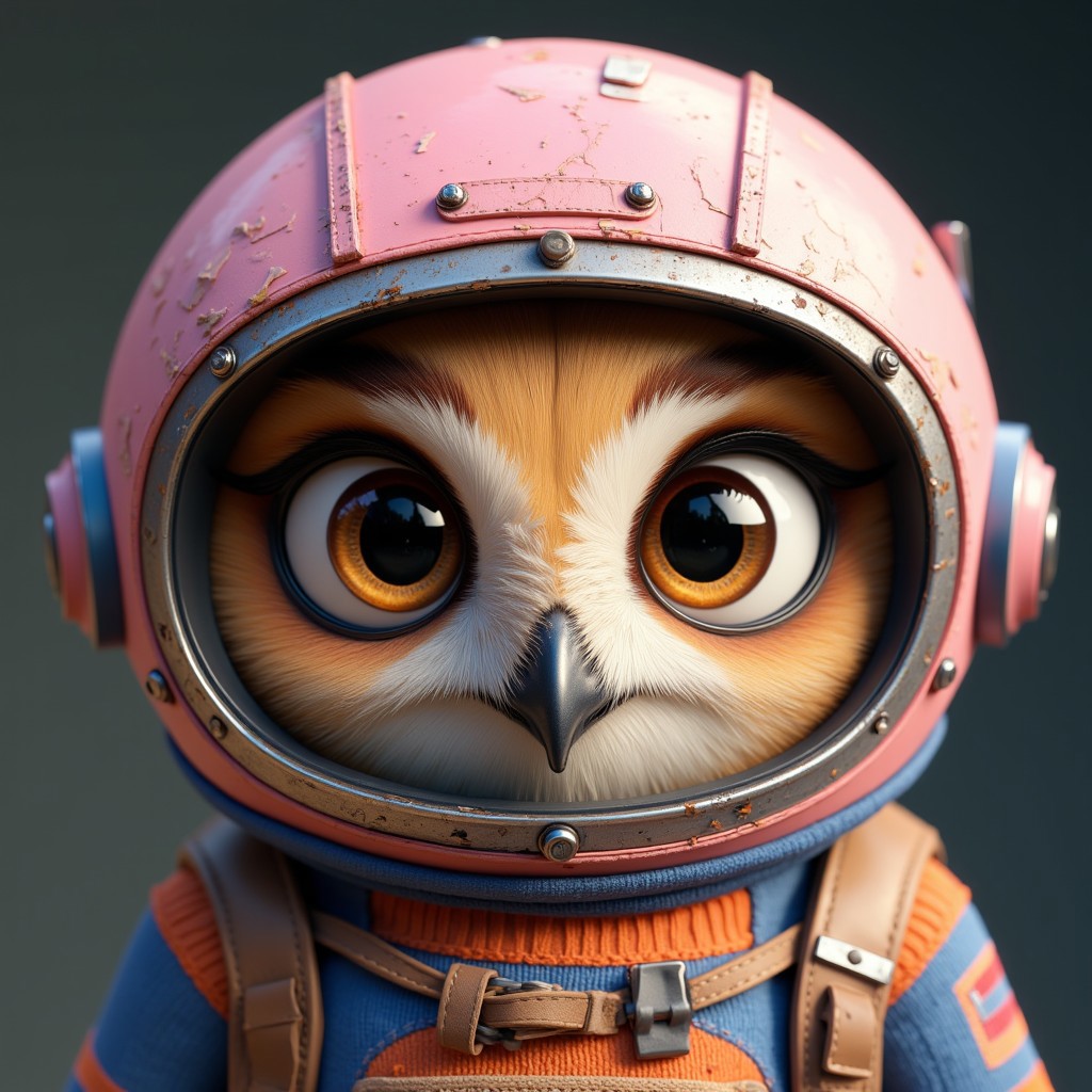 a close-up portrait of an owl wearing a worn pink space helmet with blue details, the owl has big brown eyes, wearing a blue and orange striped shirt and brown backpack, pixar style, 3d rendering