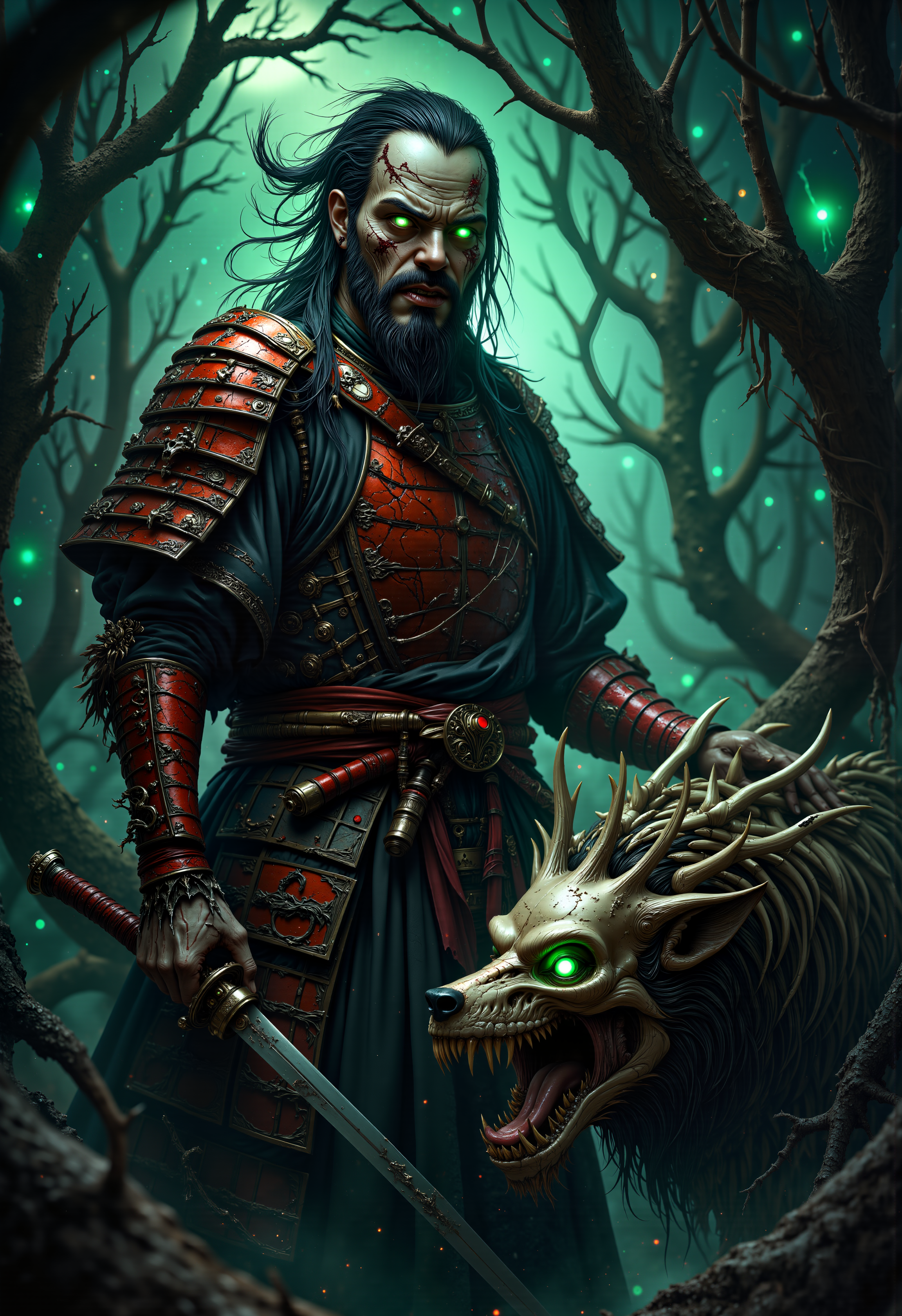 A hyper-realistic portrait, photorealistic photo close-up image of A middle-aged zombie samurai with decaying gray skin and stringy black hair stands in a twisted forest where the trees are made of bone and sinew. His tattered, blood-red armor is cracked and rusted, and his sunken eyes glow a faint green, evidence of the necrotic magic that animates him. In one hand, he grips a katana with a blade chipped and tarnished, while his other hand rests on the head of his petâa skeletal wolf with glowing green eyes and sharp, bone-like protrusions jutting from its back. The forest floor is covered in a mist of swirling, eerie fog, with strange, claw-like roots breaking through the ground. His pet growls softly, its bones rattling with each movement, while the samuraiâs lips curl into a snarl, exposing jagged, decayed teeth. The sky above is a sickly green, casting an unnatural glow over the forest as strange, ghostly shapes flit between the trees.(photography, high-resolution, dynamic, energetic,hyper-realistic, dramatic lighting, shallow depth of field.), detailmaximizer, MythP0rt<lora:midjourney_whisper_flux_lora_v01:0.5><lora:aidmaMJ6.1-FLUX-V0.1:0.4><lora:FluxMythP0rtr4itStyle:0.4><lora:detailed_flux_ntc:2.2><lora:aidmaImageUpgrader-FLUX-V0.1:0.65>