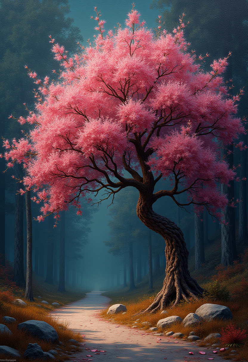 top-notch 3d blender render, detailed Grotesque Tapestry, amateurish Oil painting of a Fashwave, landscape of a Night Paradoxical Oslo and Arcadian Sami Magnolia tree, plain Drab background, dense street and blossoms, at Midday, Horror, hard Shadows, panorama, Saturated, landscape art by Jan Frans van Bloemen, Robert Hagan, Rudolf Hausner