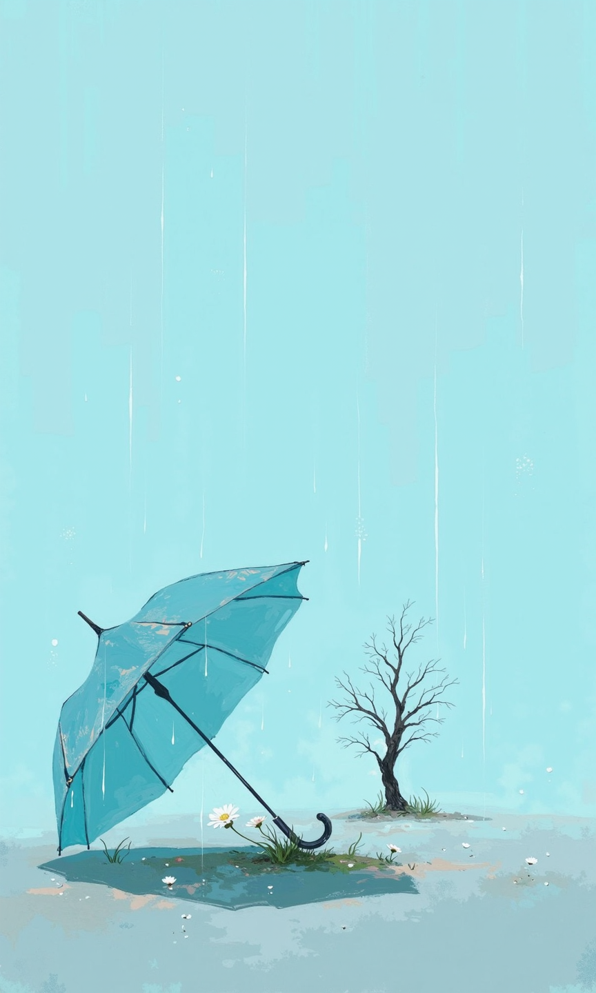 Full shot of a digital painting or illustration. A light, pastel-blue landscape, evocative of a rainy day, is the backdrop. A translucent, light-blue umbrella is positioned on the ground, angled slightly, with its handle visible. Raindrops are depicted as thin, vertical streaks. A small, single white flower is visible near the base of the umbrella, nestled in a small patch of ground. Beyond the umbrella, a simple, bare, dark-brown tree trunk and branches stand against the softly muted pastel blue sky, which appears slightly darker in the areas where the tree is located. The ground is a light bluish-gray, reflecting the rain and showing some puddles or a layer of water. Tiny, scattered, white speckles are visible on the ground, possibly representing fallen petals of a flower or other similar light debris. The overall style is soft and dreamy, with muted colors and a focus on atmospheric mood. <lora:FLUX-daubrez-DB4RZ-v2:1> DB4RZ, DB4RZ style painting