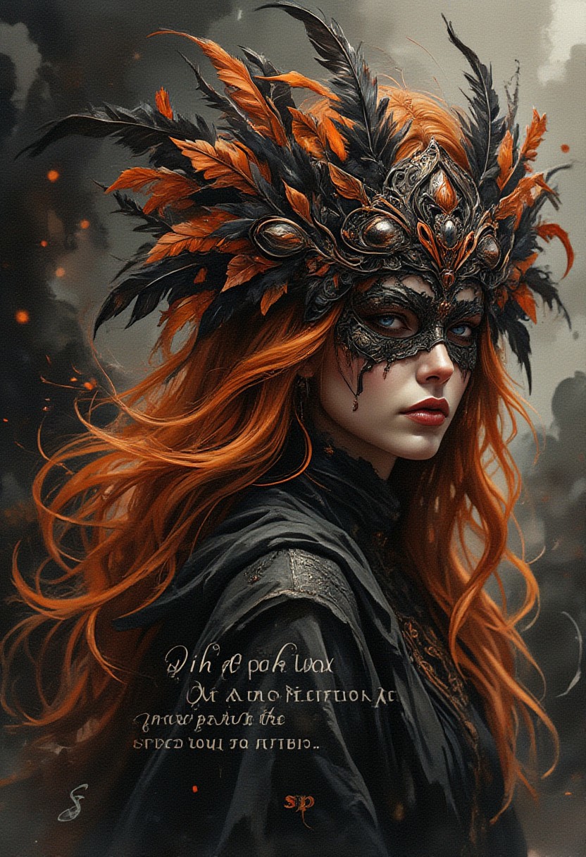 horror, monster, nightmare, fear, illustration, watercolor, A watercolor and ink wash painting of a dark fantasy scene with a woman in the foreground. She has fiery orange hair and wears an elaborate headdress and mask made from black and burnt orange feathers, combined with intricate lacework. The text "With each day, we change, growing from the lessons life teaches us," is written in a deep, meaningful style. The background is softly blurred, with rich, soft washes of black and orange. The composition exudes a mood of mysterious elegance and dark fantasy. The artist's signature "Super S" is displayed in the bottom left corner.
