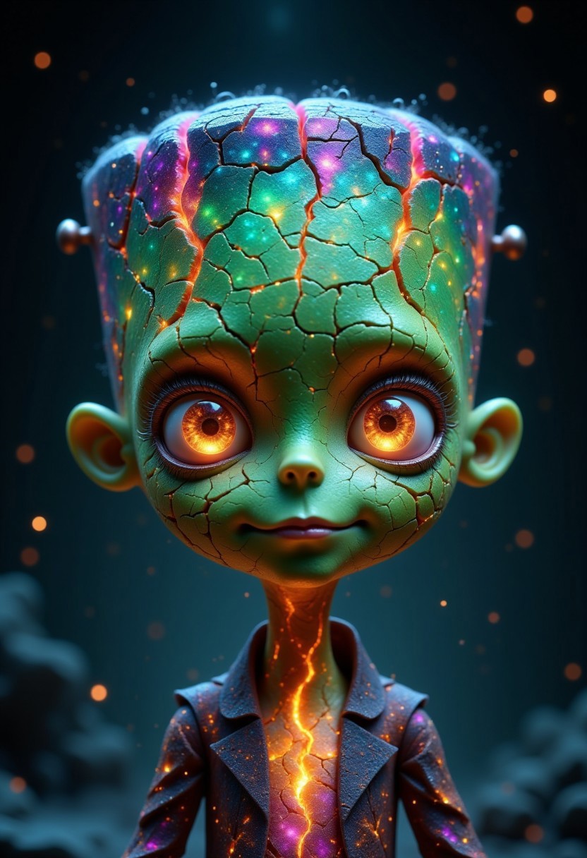 Glowing galaxy cracks, A cute, glowing version of Frankenstein's Monster with large, gentle eyes. His iconic green skin is cracking like molten lava, with glowing cracks in striking galaxy colors—emerald green, violet, and neon yellow. The light from the cracks seems to animate him with cosmic energy, giving him a powerful yet cute appearance. The dark background highlights the glow from the cracks, and small, floating star-like particles surround him, blending the classic monster theme with a sense of cosmic wonder. The scene merges Halloween's monstrous with a hint of interstellar magic.