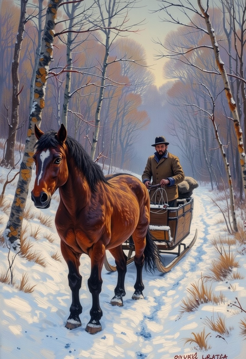 OByouhua, oil painting of a sled being pulled by a horse in snowy forest, man in rustic old time clothing behind the sled guiding it.
