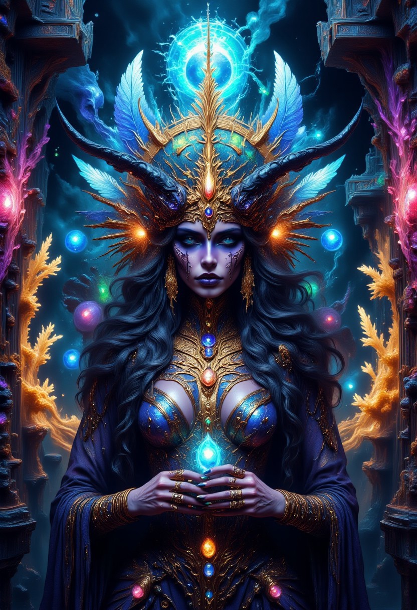 Contrast Colors, Hyperrealistic, Cinematographic Photography, Detailed, Best Quality, High Resolution, Intricate Details, Vivid Colors, Detailed Style Photography Hyperrealism oil painting a majestic, graceful, erotic woman. warrior by day. lover in the night. harmonious fantasy world. colorful and harmonious. symmetrical buildings that are one with nature. plants are part of the buildings. The clothing is made from plants. free from chemicals. and yet so detailed and elegant. humans and animals live in harmony. Animals are breathtakingly beautiful and captivate the viewer. perfection style, vivid colors, colorful, dark background, aidmaMJ6.1, FntsyPstlCE style, future_fashion, future_outfit, Egyptian dark fantasy, glowing opal fantasy, opalescence, made of opal, woman with dress, standing. long hair. crown