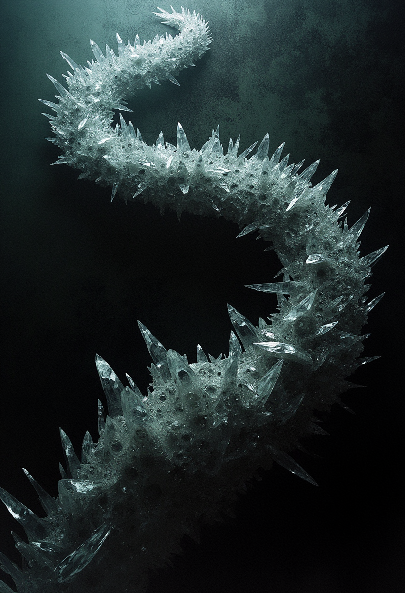dark art by Ruan Jia, Carne Griffiths and Classic Disney, Digital art, In a dimly lit room, a masterpiece comes to life, intricate crystals and spiraled structures. The crystals are made of shimmering silver material, with deep reflections that seem almost otherworldly. Sharp focus, with sharp strokes, , intimate portraits, Illustration, urban installations, ruled by ruthless criminal corporations, Pacific Northwest, English landscapes, deconstructivist, artistic experimentation, flat compositions, vintage book pages, Expressionist painting, nautical, vibrant, very inspirational, detailed, beautiful, quality, <lora:models\Flux\- Flux1 - vanta_black_V2.0:1.1>,