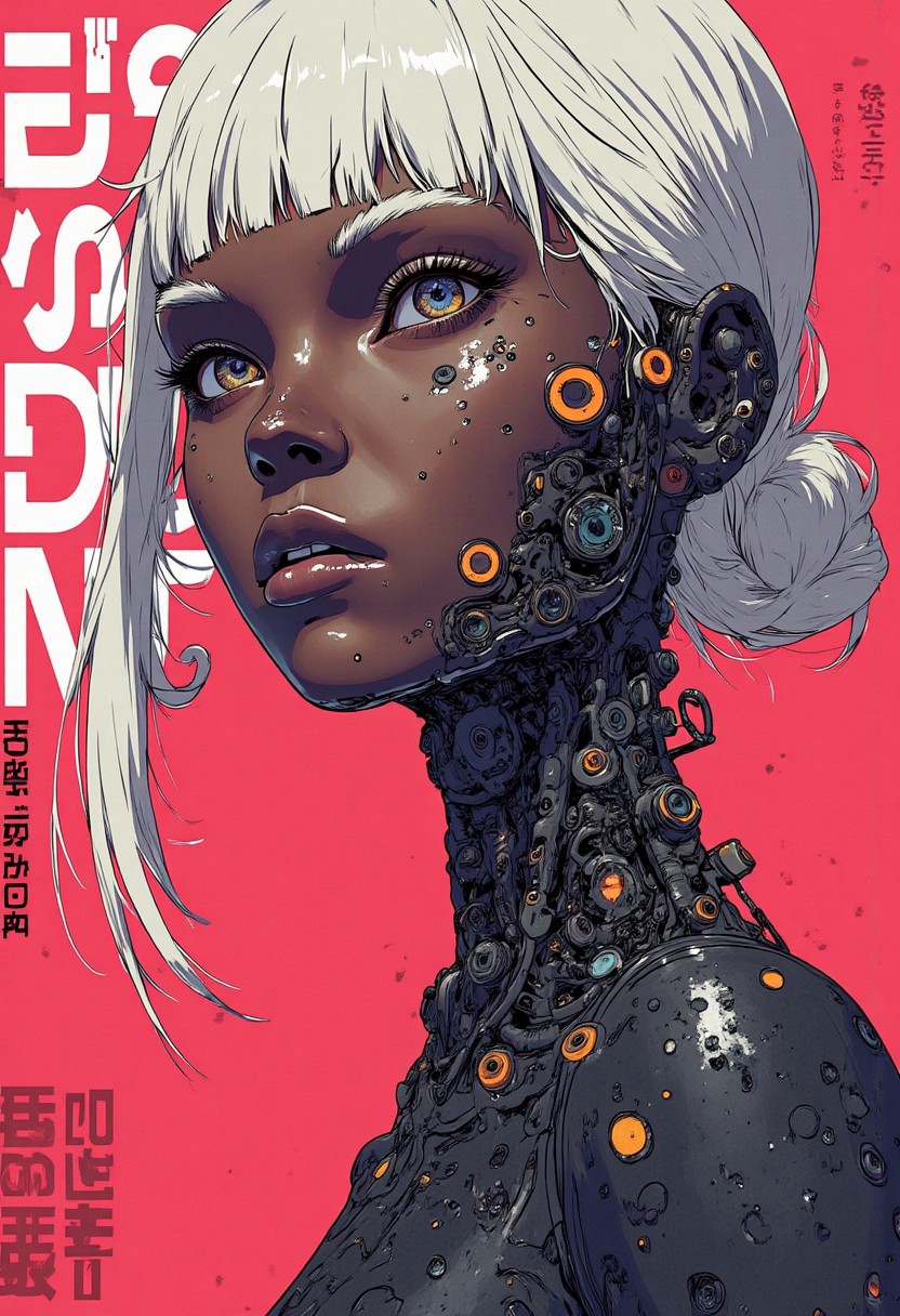 Skindentation, very dark skin, dark-skinned female, thick lips, puffy lips, horror \(theme\), long neck, blunt bangs, hair over eyes, white hair, monster girl, monster, no humans, cyberpunk,